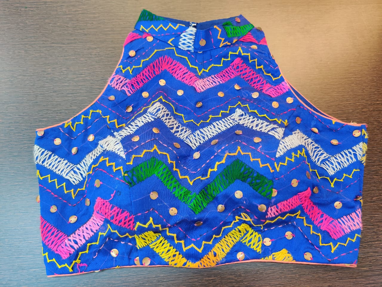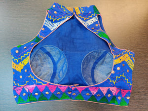 Gorgeous blue sleeveless sari blouse with multi thread embroidery. Shop designer saree blouse online in USA from Pure Elegance.