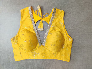 Bright yellow embroidered sleeveless saree blouse. Buy designer blouse in USA from Pure Elegance.