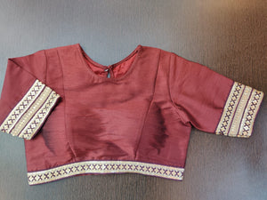 Stunning brown designer saree blouse with embroidered border. Shop designer saree blouse online in USA from Pure Elegance.