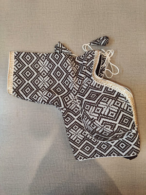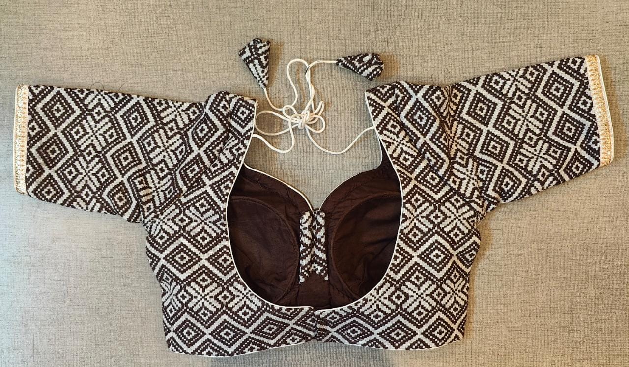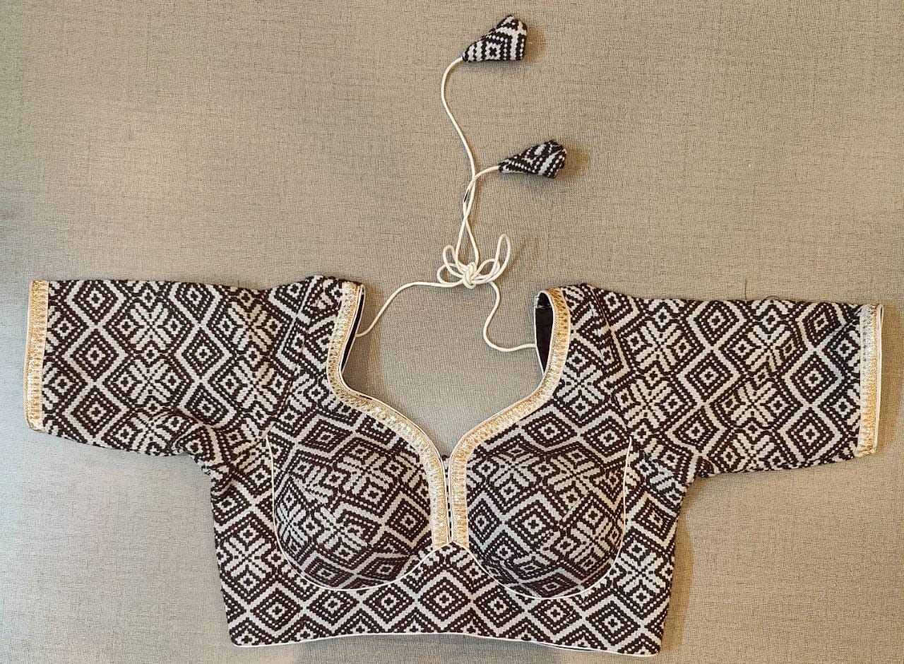 Beautiful coffee brown and white handloom choli-cut saree blouse with sequin lace. Buy designer blouse in USA from Pure Elegance.