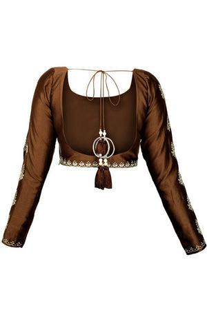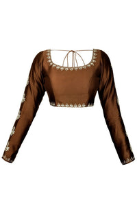 Beautiful copper saree blouse can be matched with many sarees! The blouse is made in Varanasi chanderi and is adorned with zari and gota patti embroidery. Shop online at Pure Elegance or visit our store in USA!
