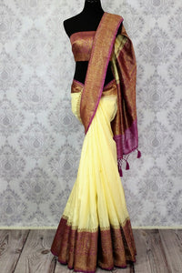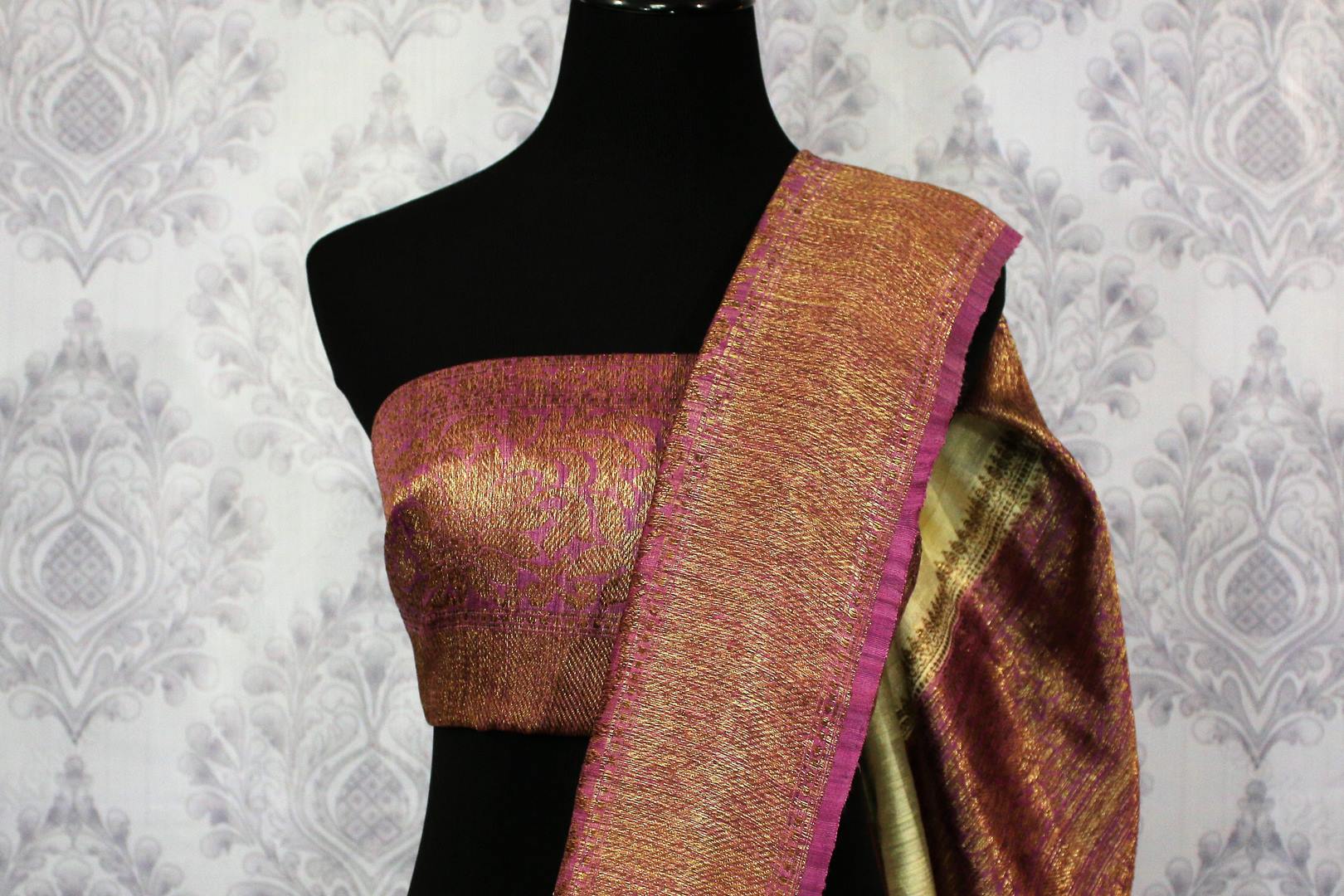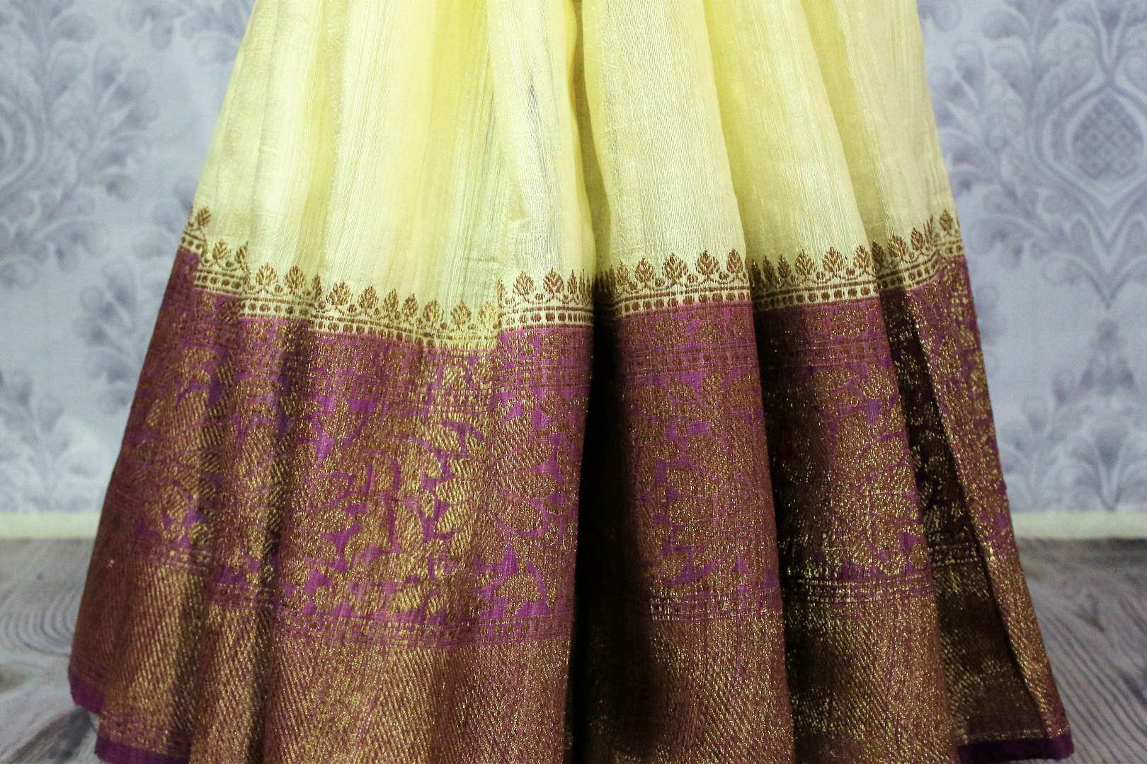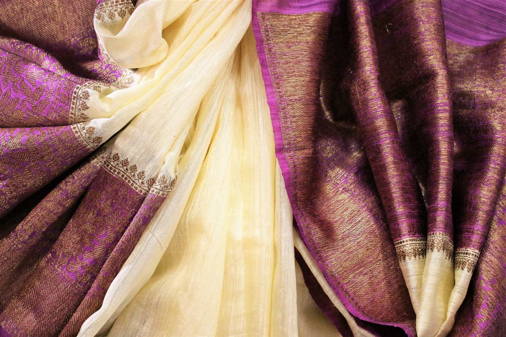Graceful cream Banarasi tussar saree for special occasions. The saree has a beautiful purple zari border and pallu which makes it absolutely striking. It comes with a matching blouse piece. Shop online at Pure Elegance or visit our store in USA!