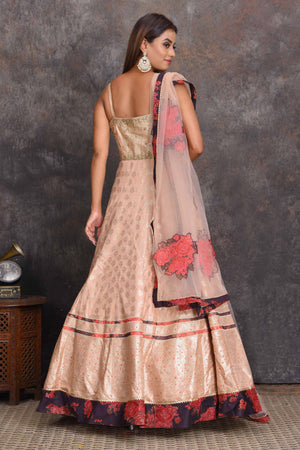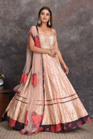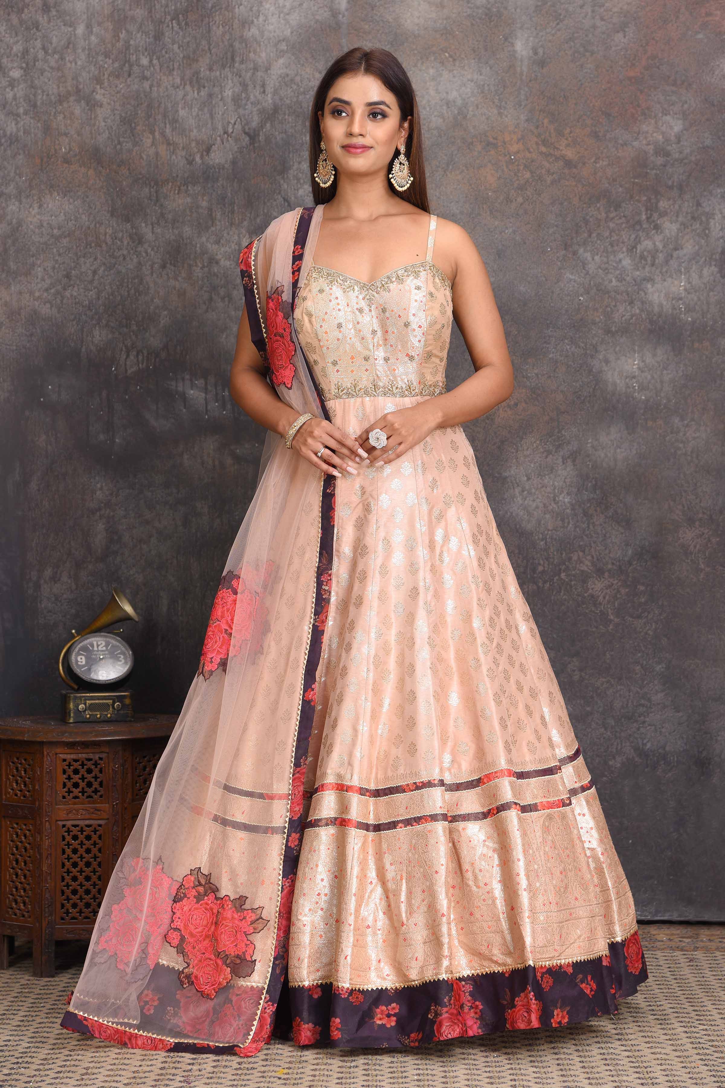 Look your best at weddings and festive occasions in this beautiful cream chanderi Banarasi Anarkali suit with floral border. It comes with a matching dupatta.