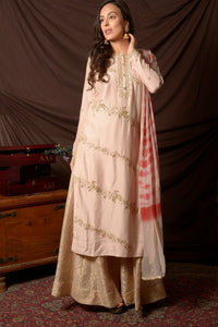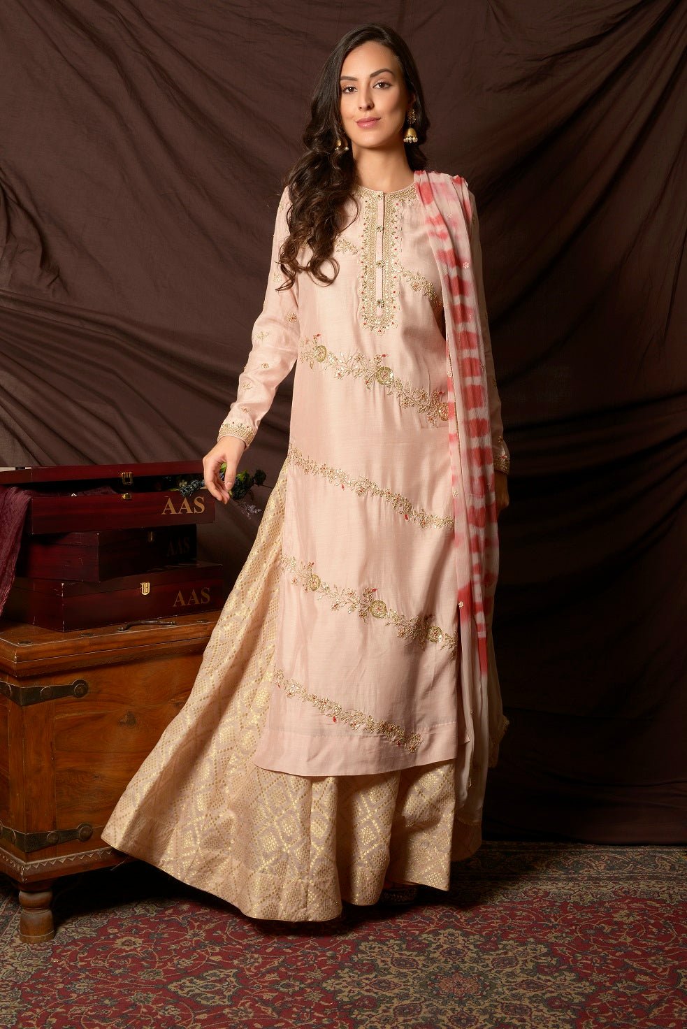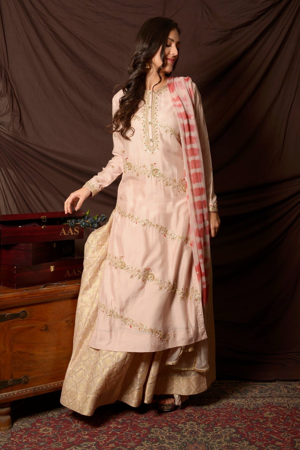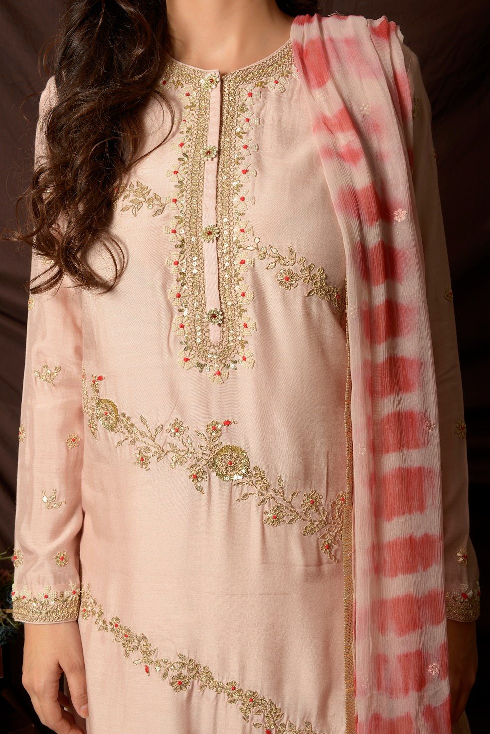 Lovely cream embroidered chanderi suit with palazzo and tie and dye dupatta. The suit is a perfect choice for occasions like festivals and sangeet. Shop designer Indian suits in USA from Pure Elegance.