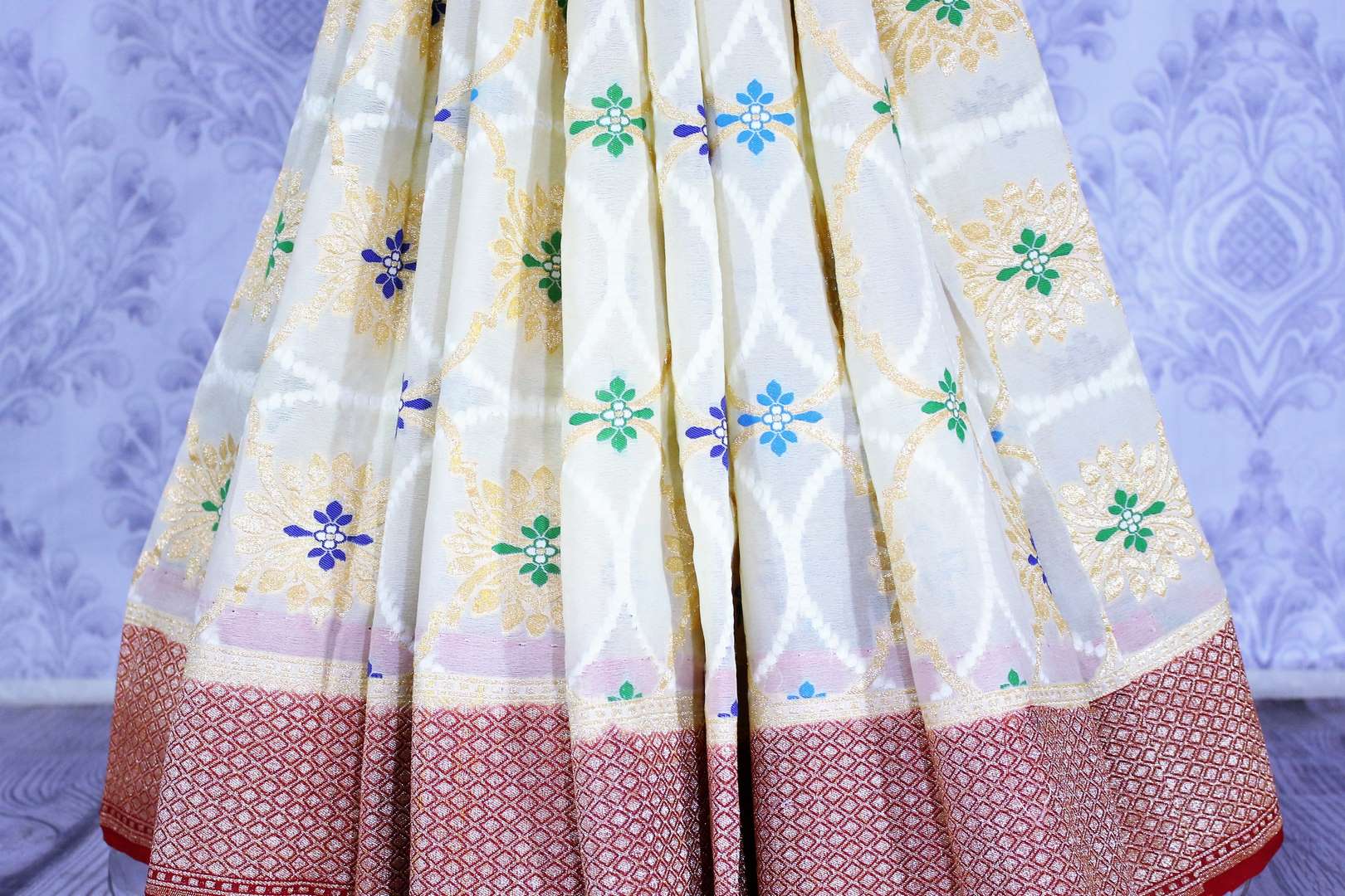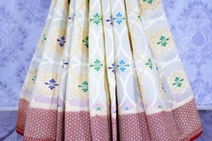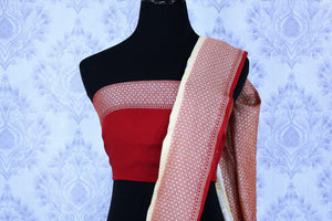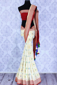 Cream georgette Banarasi saree for a traditional Indian look at festive occasions. The saree has a striking red zari border and pallu and overall minakari work which makes it so traditional. It comes with a matching red blouse piece. Shop online at Pure Elegance or visit our store in USA!