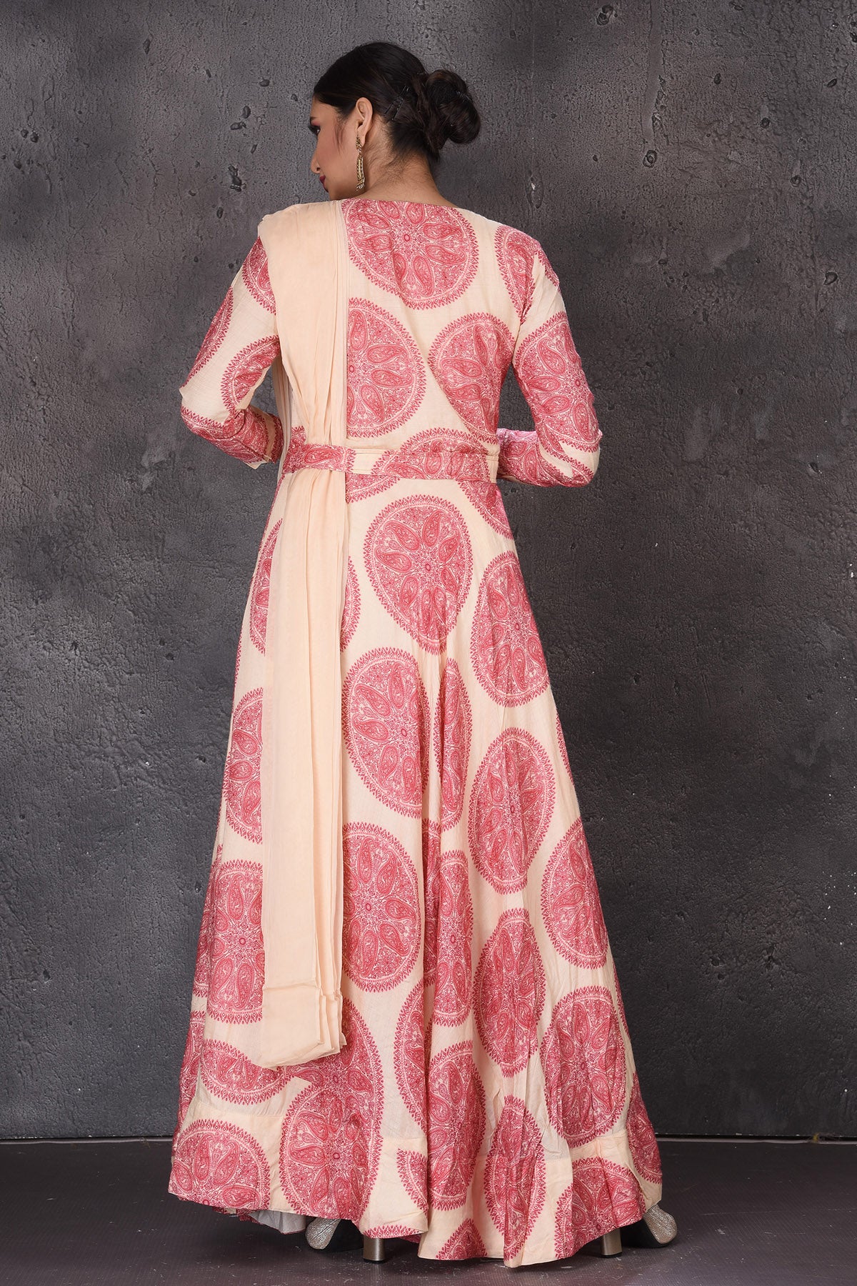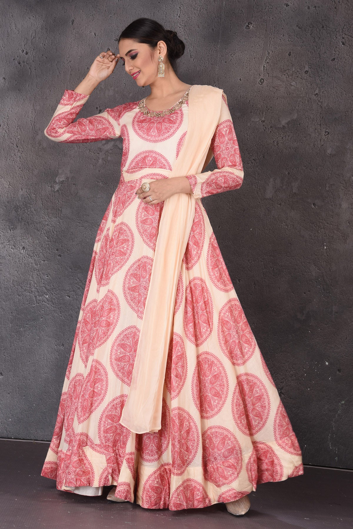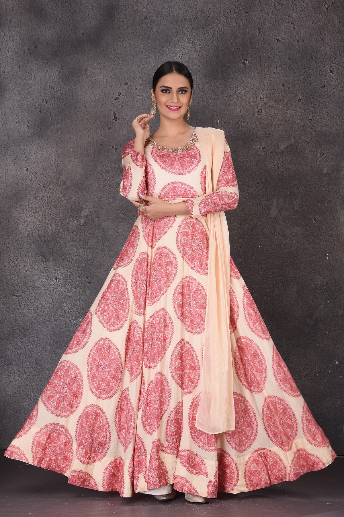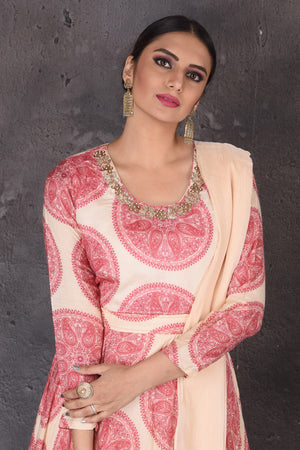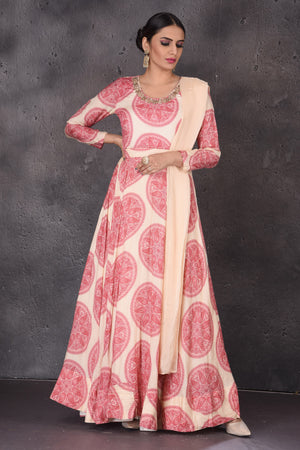 Look chic and stylish at wedding festivities in this beautiful cream printed and embroidered floorlength Anarkali suit with matching dupatta. Shop designer suits in USA from Pure Elegance.
