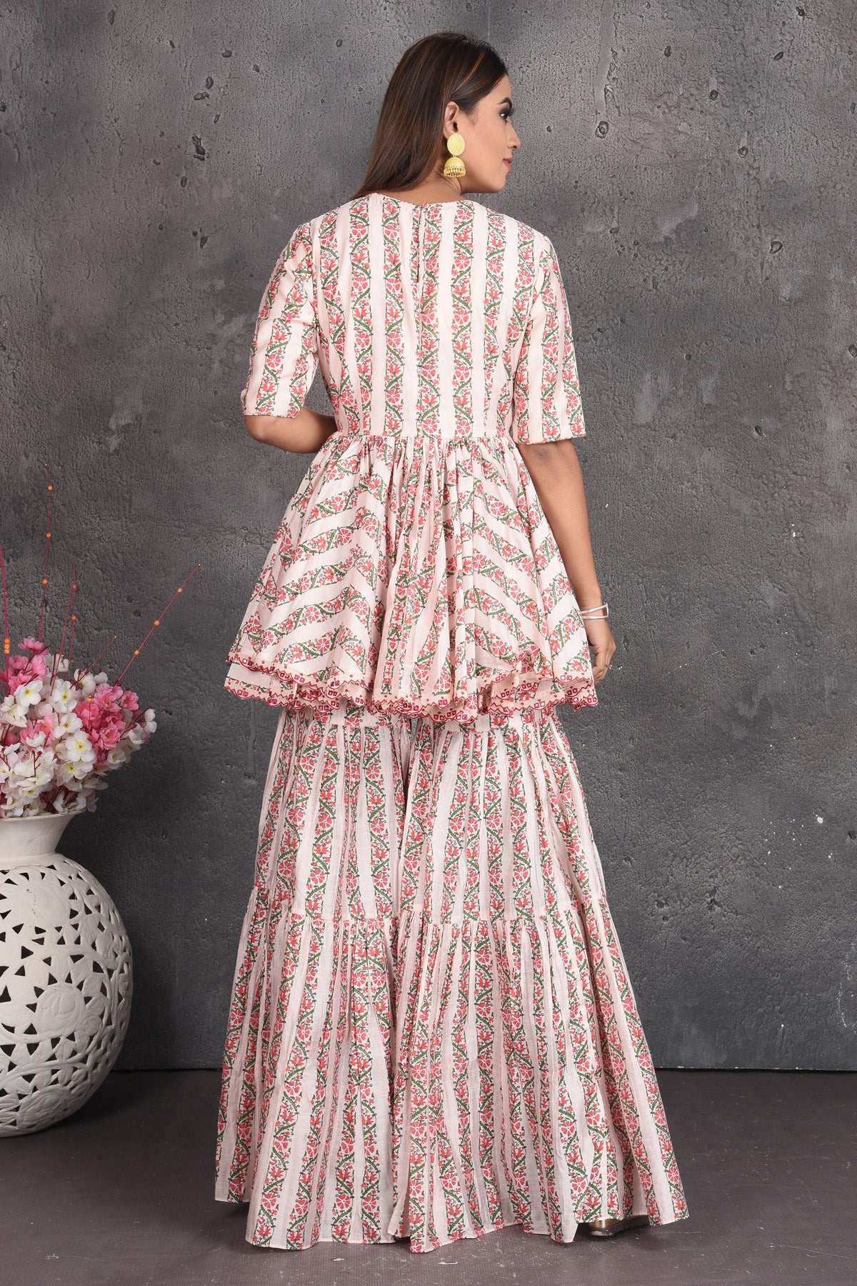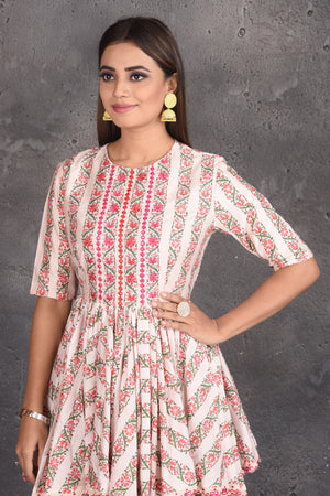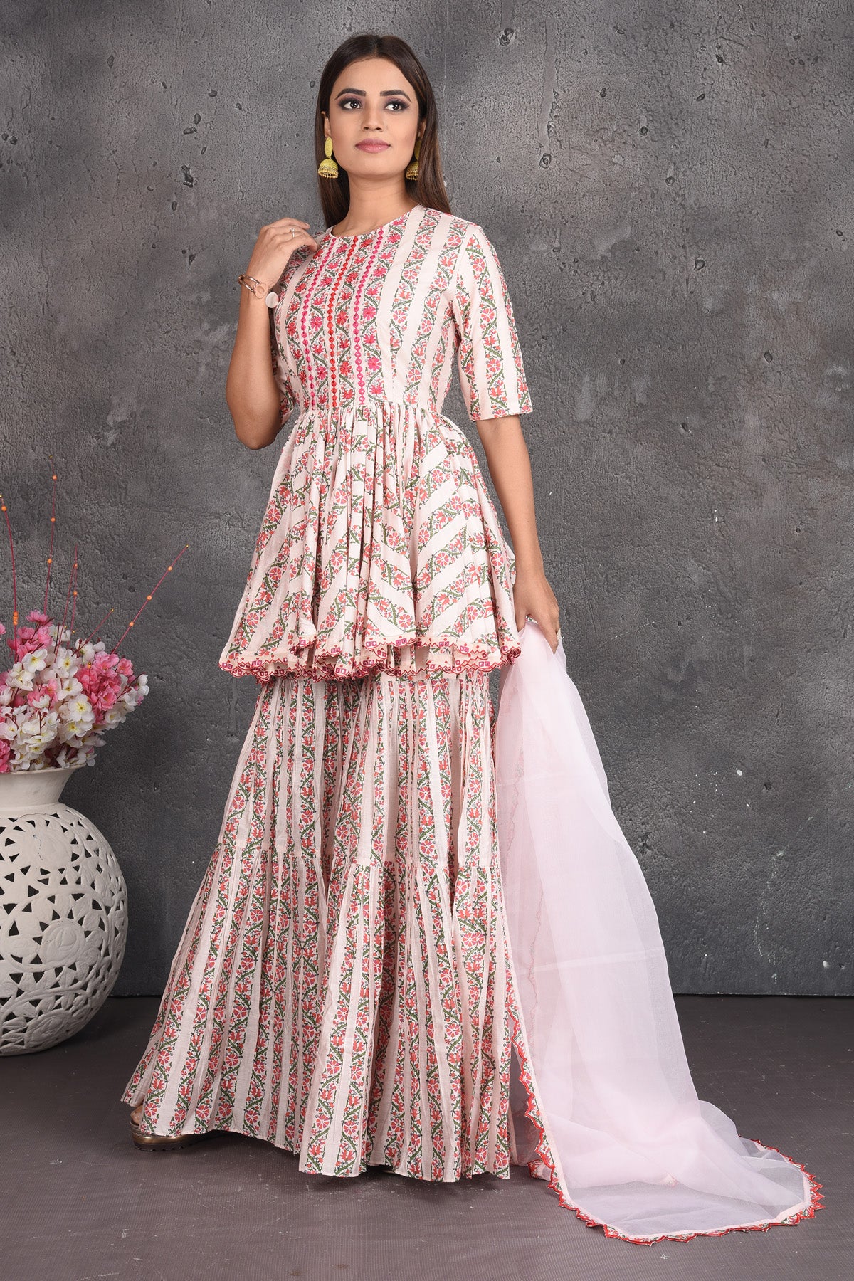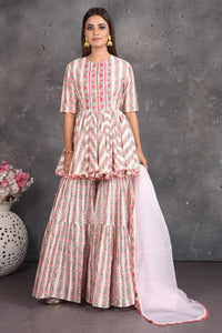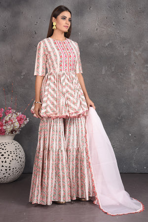 Set a fashion statement at parties in this beautiful cream printed peplum sharara suit with dupatta. Shop designer dresses in USA from Pure Elegance Indian fashion store in USA.