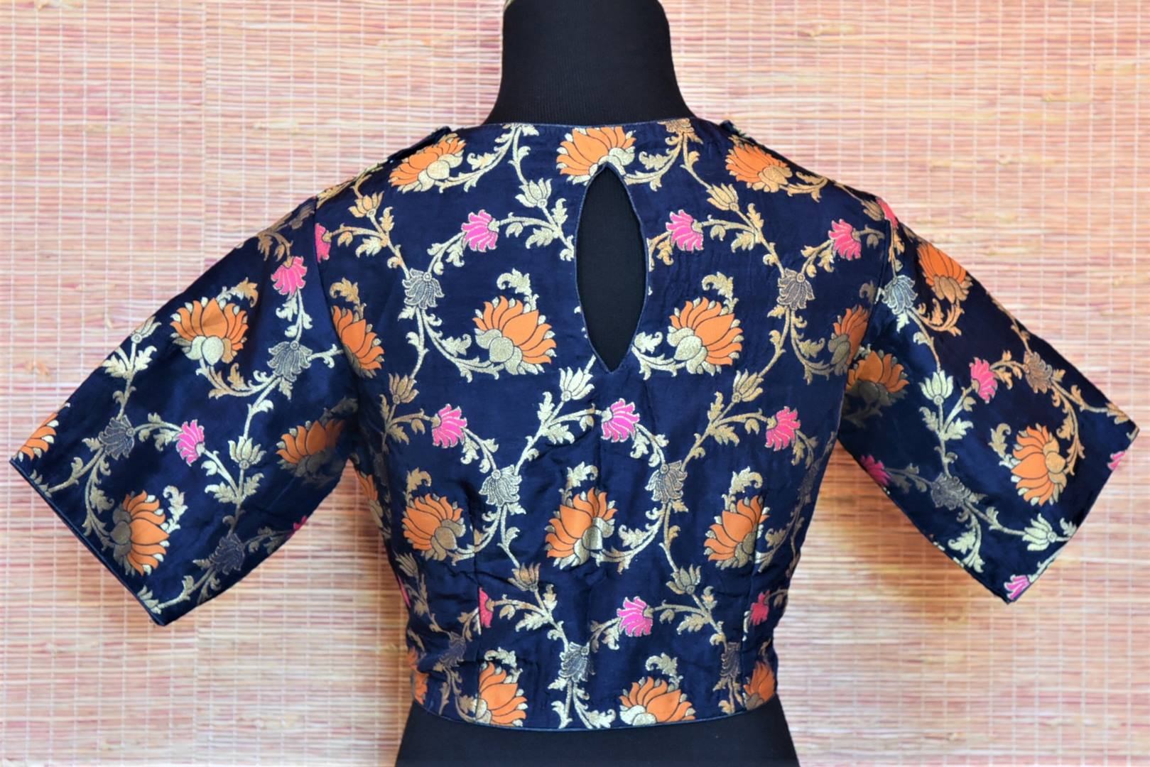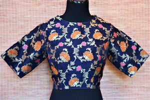 Elegant dark blue Banarasi readymade sari blouse. The blouse has a beautiful zari minakari floral design. Shop online from Pure Elegance.