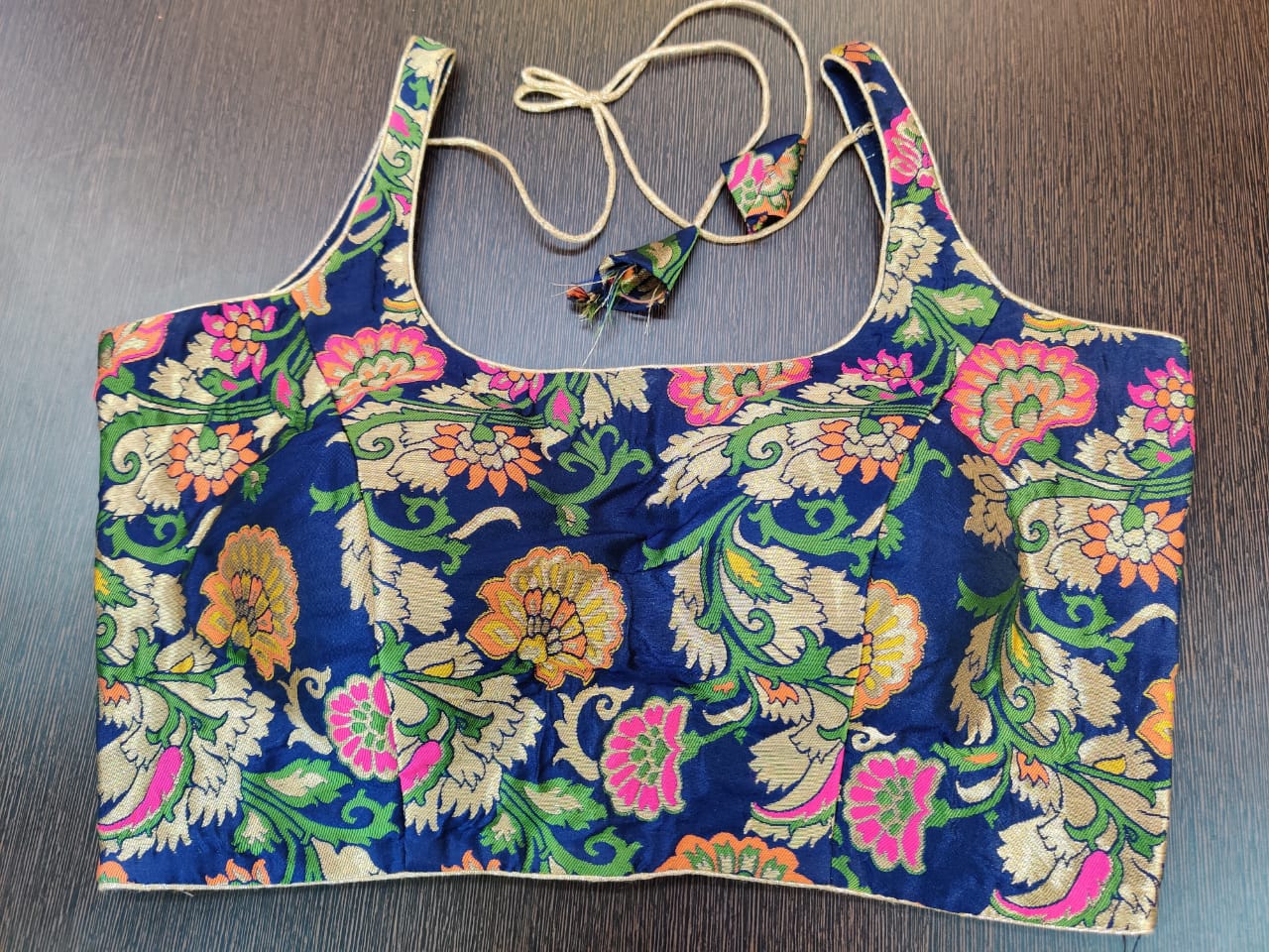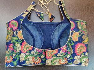 Stunning dark blue Banarasi sleeveless designer sari blouse. Buy designer blouse in USA from Pure Elegance.
