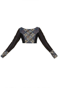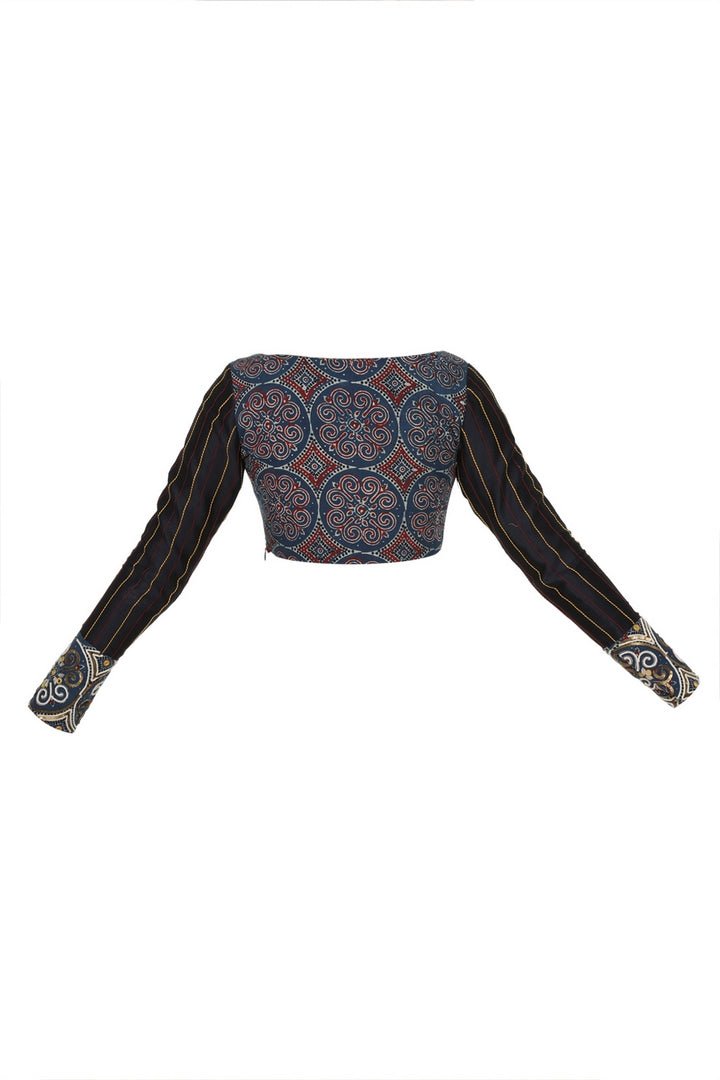 This blue and black ajrak print boat neck blouse in chanderi fabric will make you look absolutely stunning on a casual day with any bright color saree. The applique work and running stitch detailing on the sleeves makes it all the more captivating. Shop online at Pure Elegance or visit our store in USA!