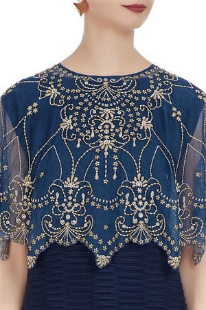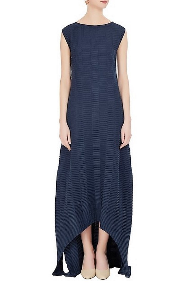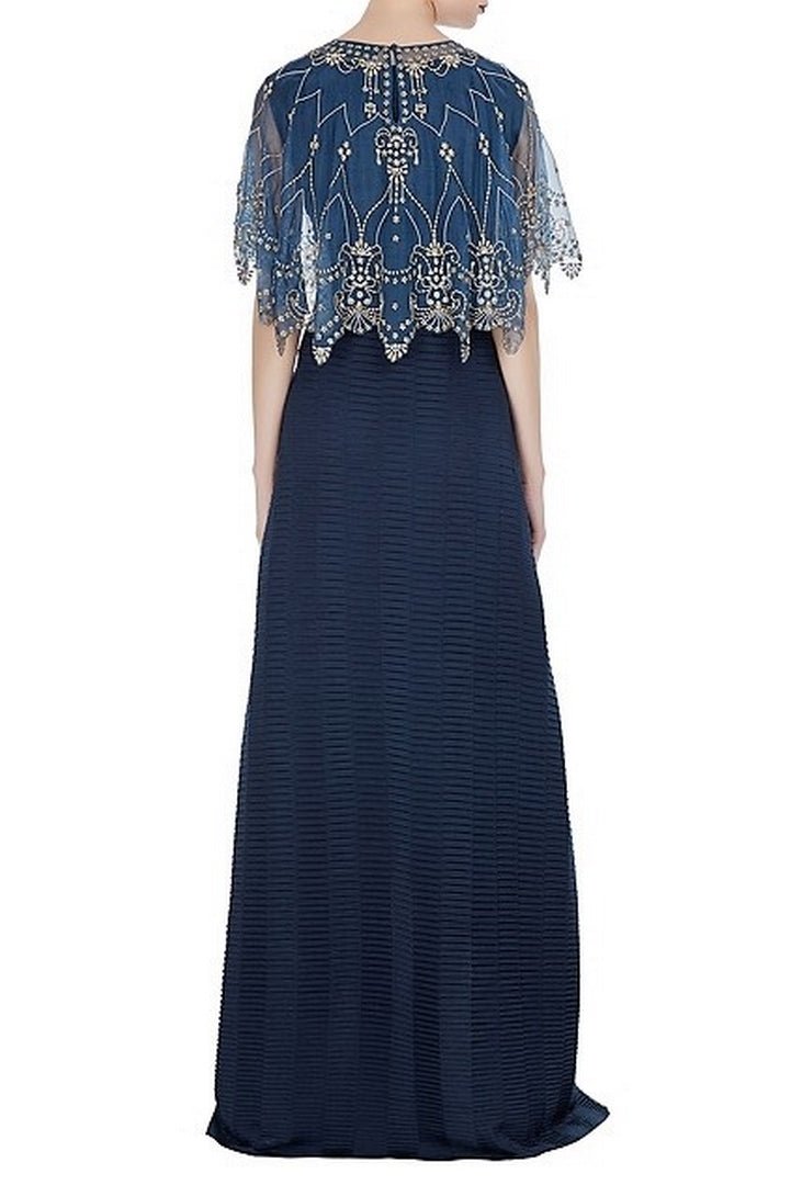 Be red carpet ready in this alluring navy embroidered circular cape with crinkled hi-low dress by Kavita Bhartia. The ensemble is made in organza and chiffon. Shop online at Pure Elegance or visit our store in USA.