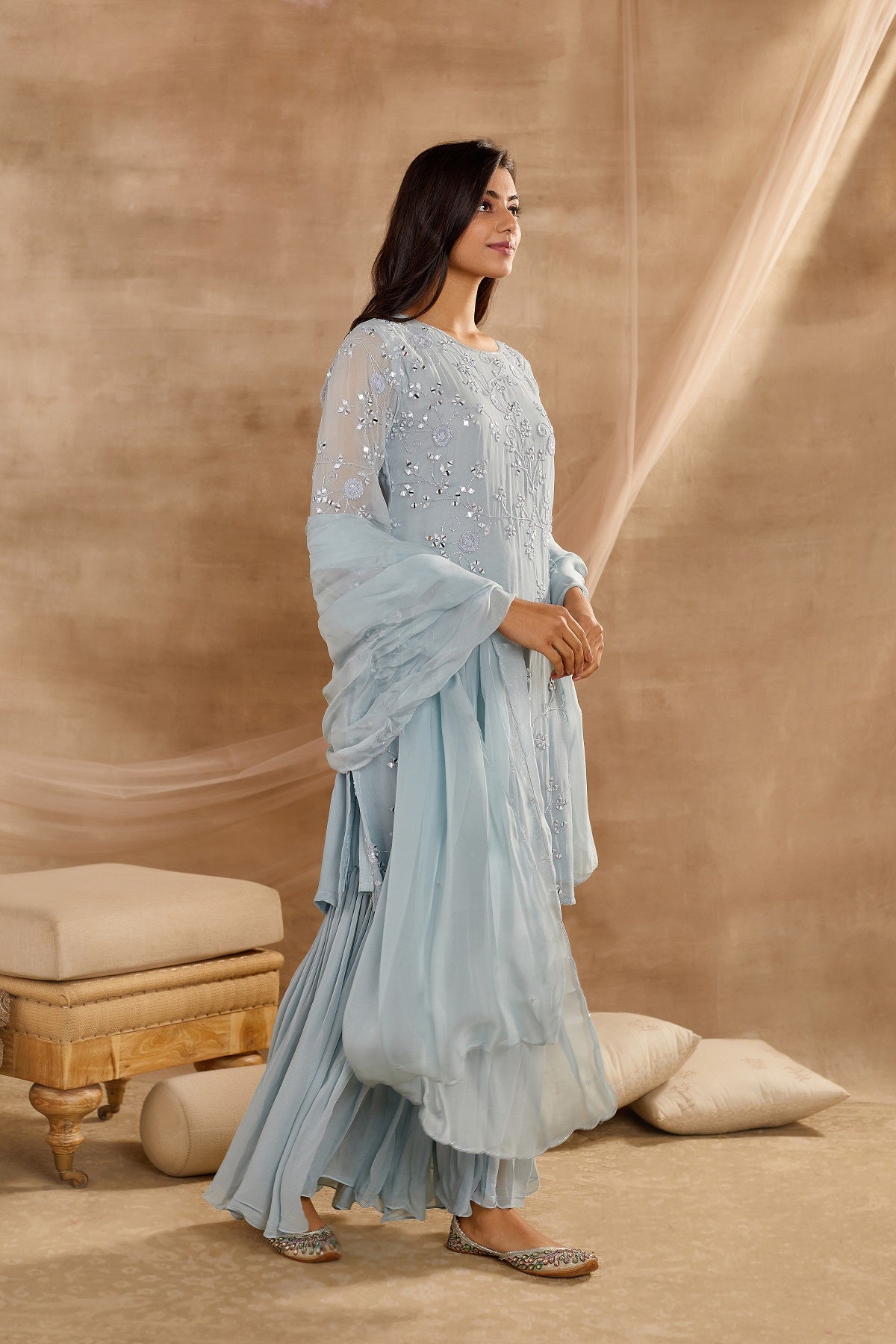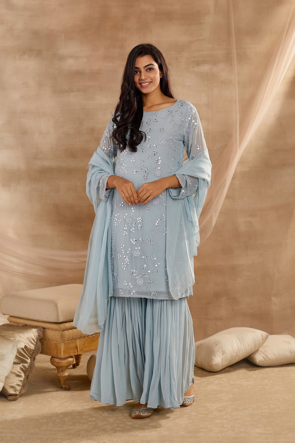 Beautiful dusky blue embroidered georgette sharara suit. It is perfect for parties and special occasions. Shop online from Pure Elegance.