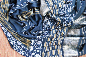 Ethnic blue Gajji silk Ajrak print dupatta is a perfect match to your traditional suits. It has a silver border and pop of white and cream printed Ajrak design which makes it a must-have for an Indian ethnic wardrobe. Buy online from Pure Elegance!