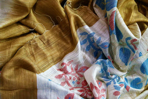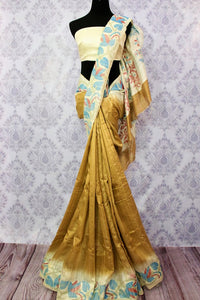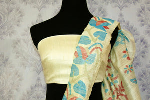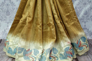 Graceful golden beige matka silk saree for parties and festive occasions. The saree has a stunning white floral border and pallu which makes it absolutely gorgeous. It comes with a white blouse piece. Buy online from Pure Elegance or visit our store in USA!