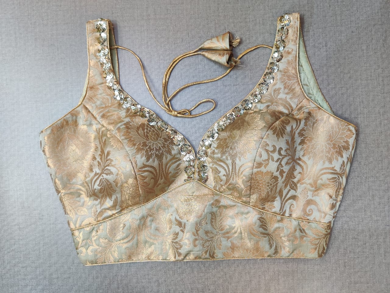 Stunning golden embroidered Banarasi sleeveless sari blouse. Buy designer blouse in USA from Pure Elegance.