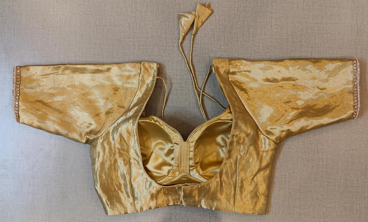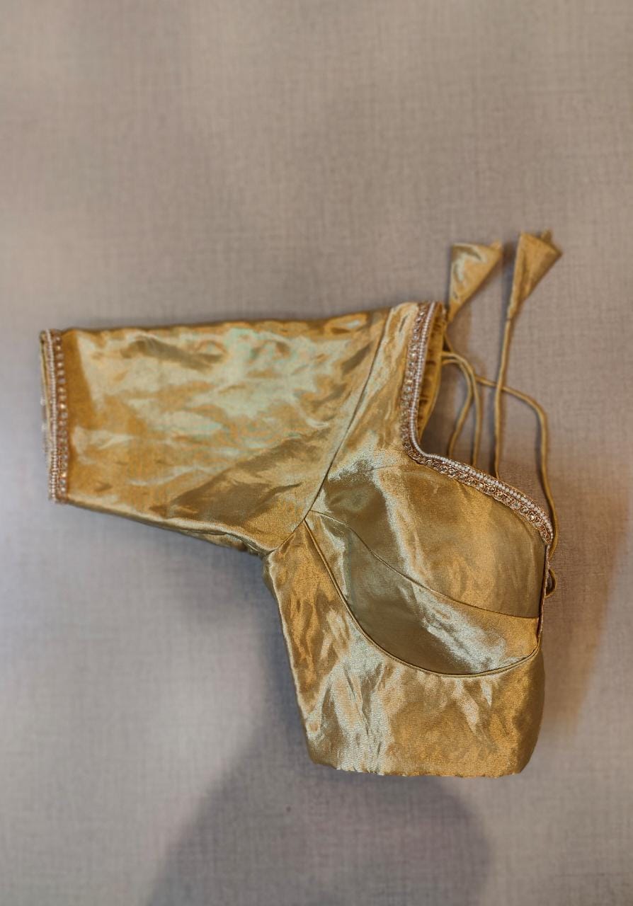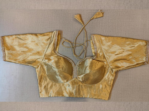 Beautiful golden tissue choli-cut saree blouse with stone work lace. Buy designer blouse in USA from Pure Elegance.