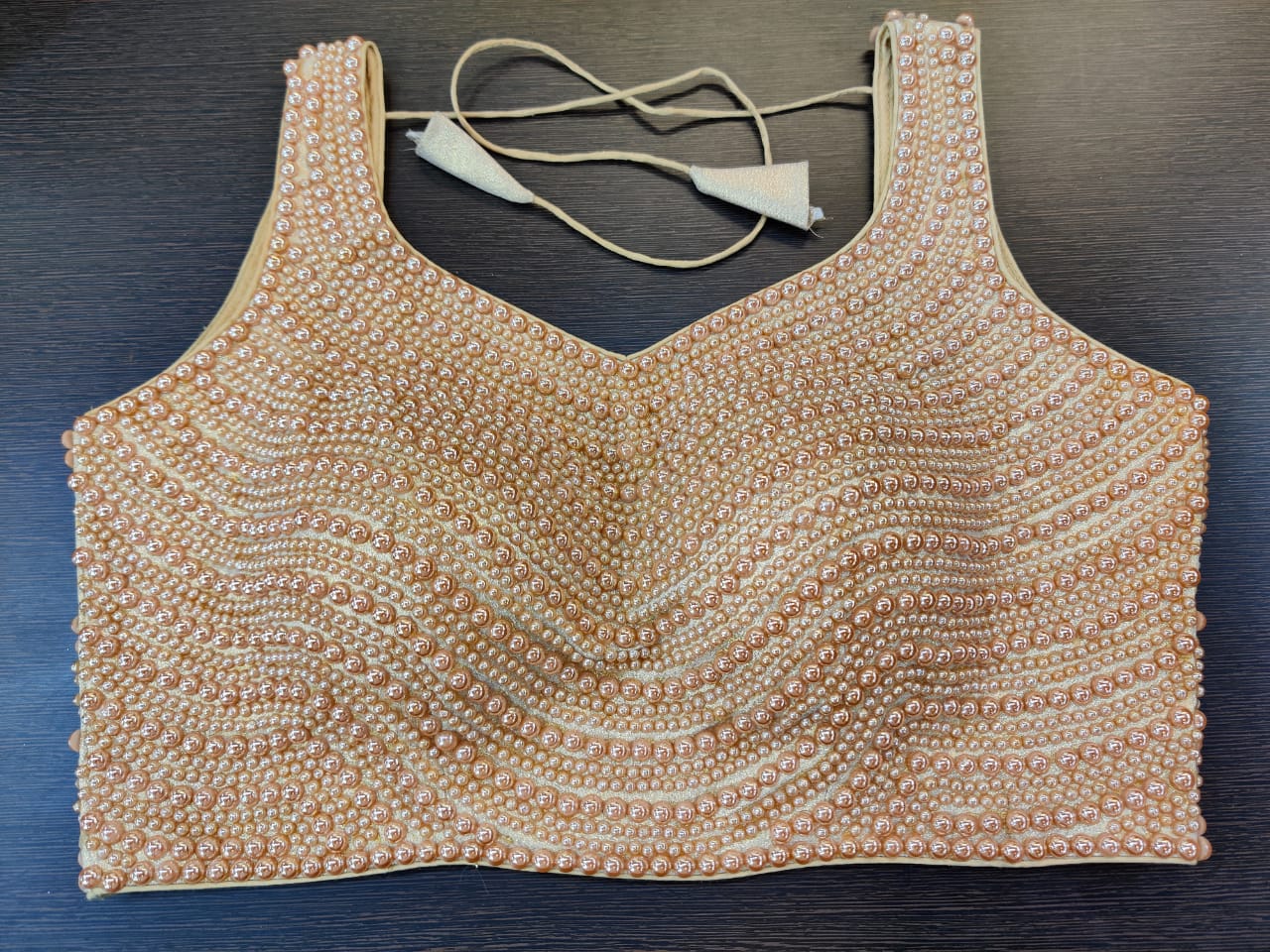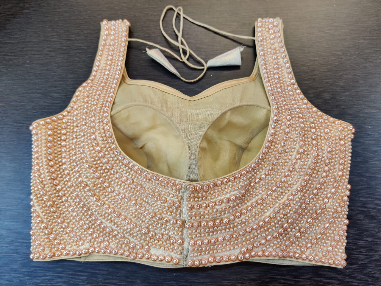 Beautiful cream pearl embroidery sleeveless saree blouse. Shop designer saree blouse online in USA from Pure Elegance.