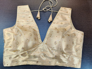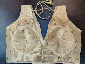 Stunning golden embellished sleeveless saree blouse. Buy designer blouse in USA from Pure Elegance.