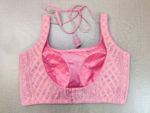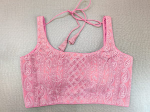 Gorgeous pink Chikankari style sleeveless sari blouse. Buy designer blouse in USA from Pure Elegance.