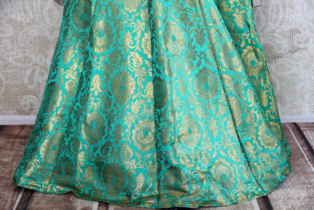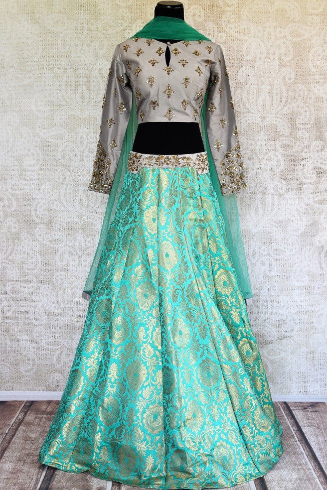 Beautiful designer Banarasi skirt with silk embroidered blouse is a perfect choice for wedding or sangeet. It has a striking color palette of green and grey beautifully decorated with gold Banarasi work and sequin embroidery. The outfit is traditional yet modern with a crop top style blouse. It comes with a net dupatta. Buy online from Pure Elegance.
