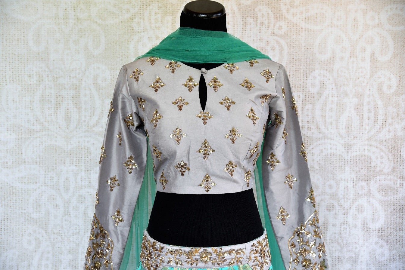 300082 Green Banarasi Skirt with Embroidered Grey Silk Blouse and Dupatta