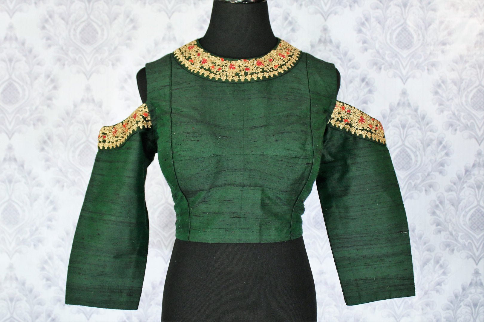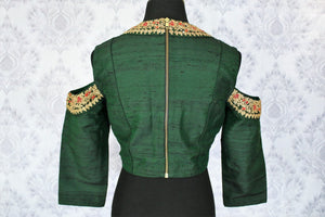 Stylish dark green embroidered cold shoulder saree blouse for parties and festive occasions. The blouse has delicate embroidery on sleeves and neckline which makes it more festive. Buy online from Pure Elegance or visit our store in USA!