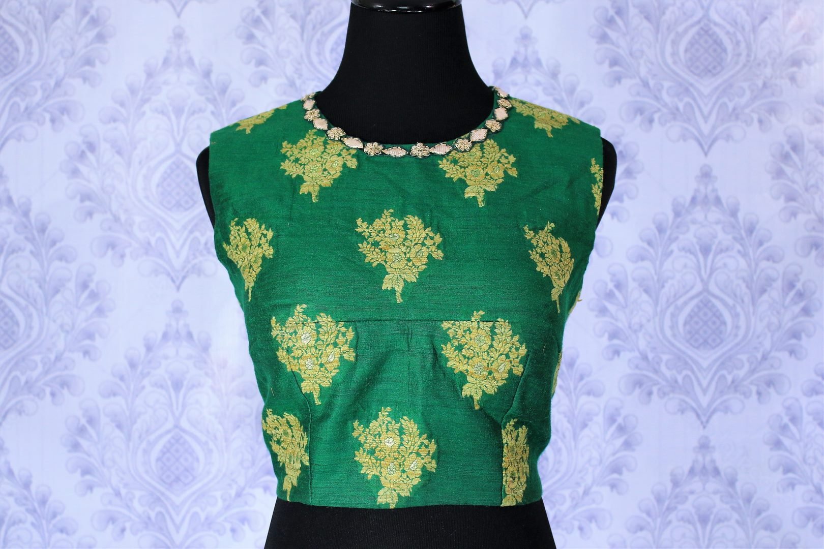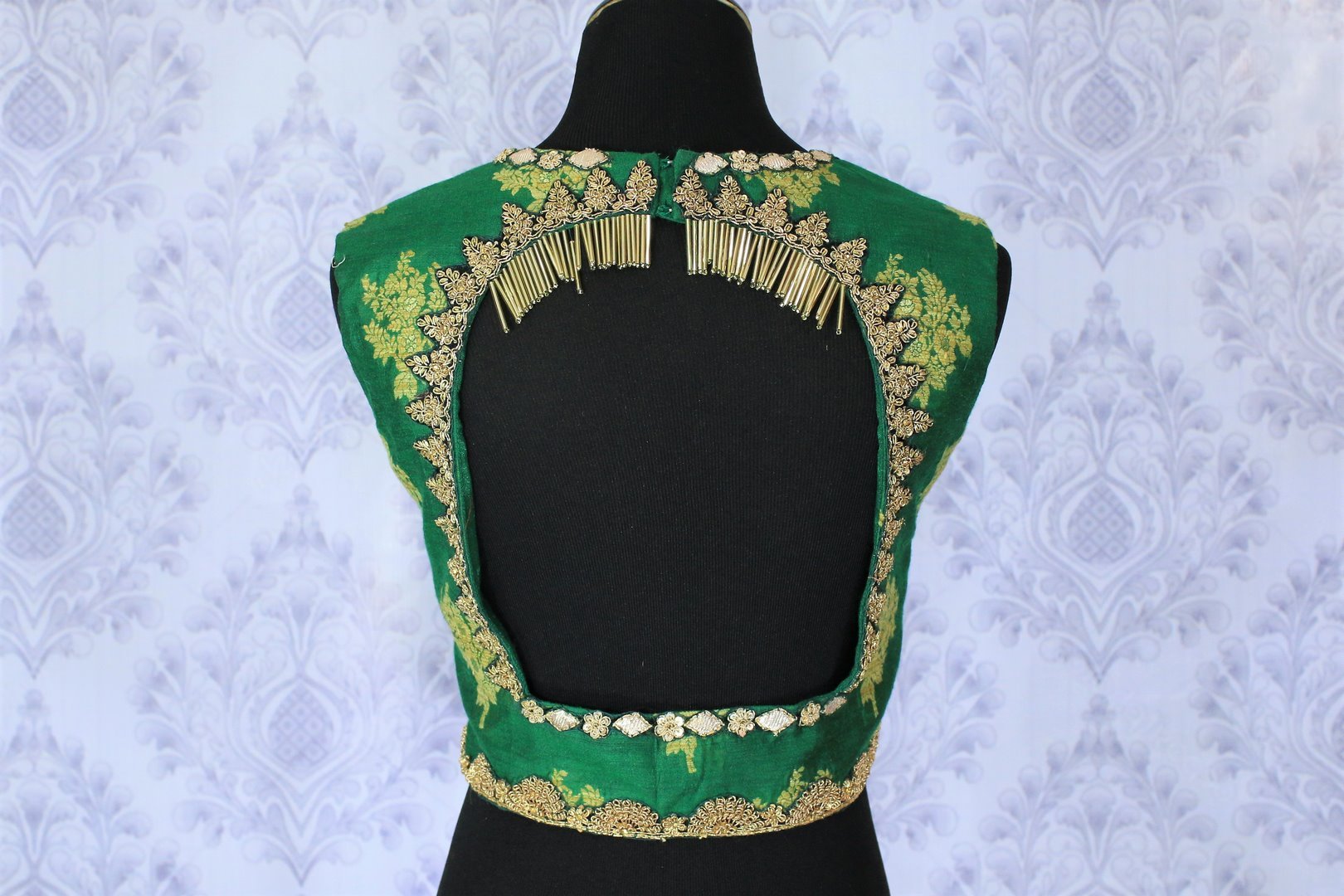 Beautiful green embroidered sleeveless saree blouse is a perfect blend of traditional design with a modern cut. The blouse is adorned with butas and has a stylish back design with hanging tassels. Shop online at Pure Elegance or visit our store in USA!