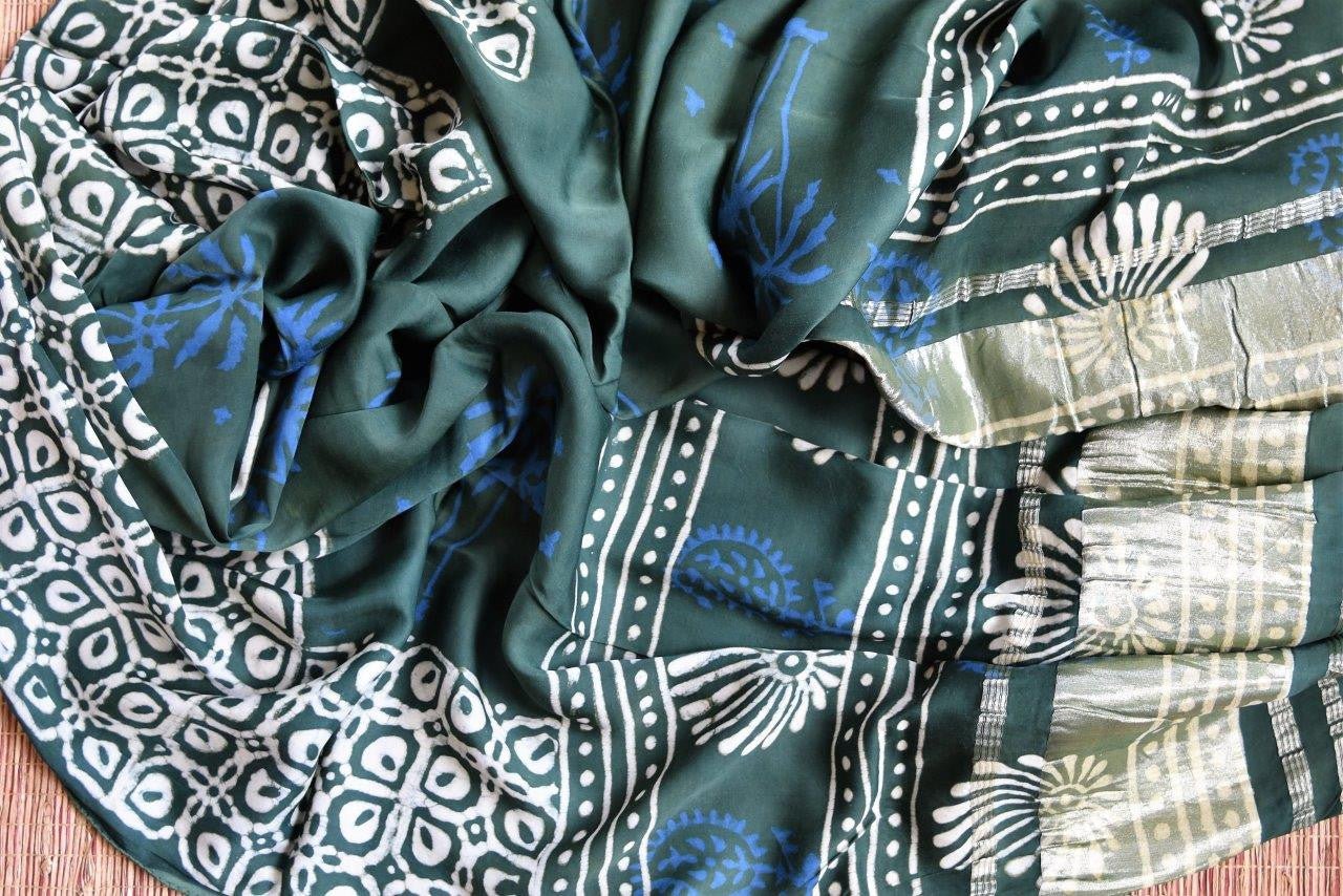 Traditional green Gajji silk Ajrak print dupatta is a perfect match to your Indian suits. It has a subtle gold border and blue and white Ajrak print. A dupatta to add spark to your traditional style. Buy online from Pure Elegance!