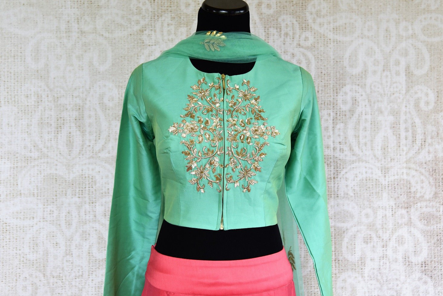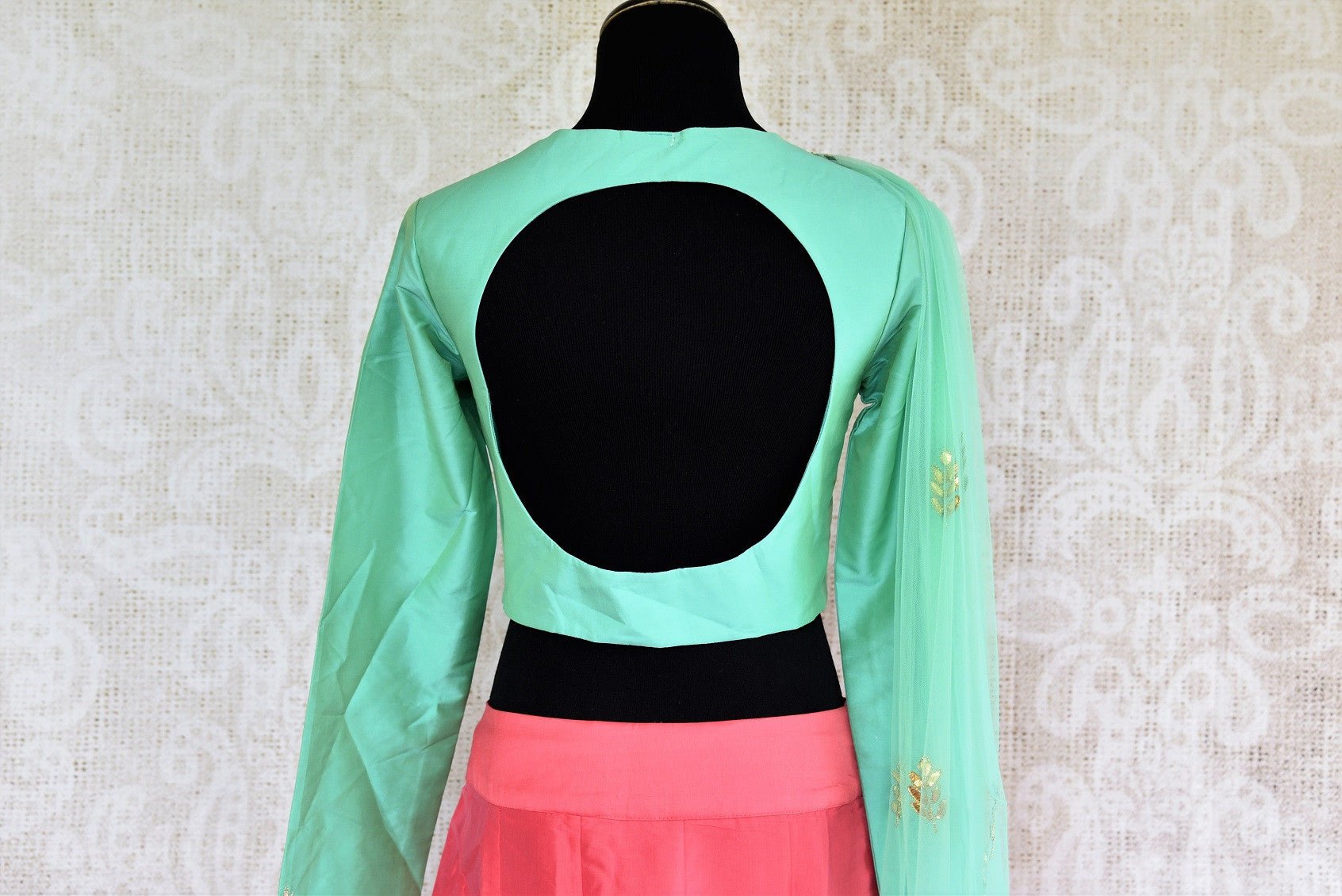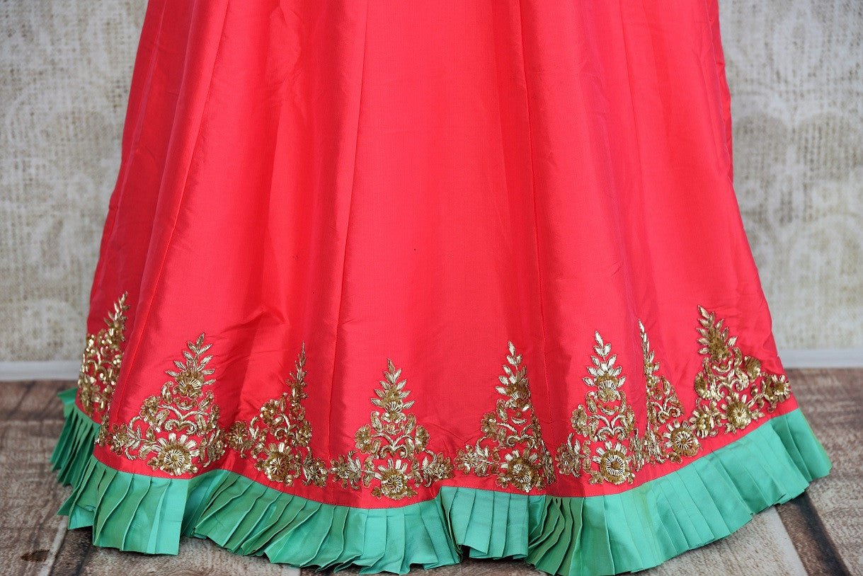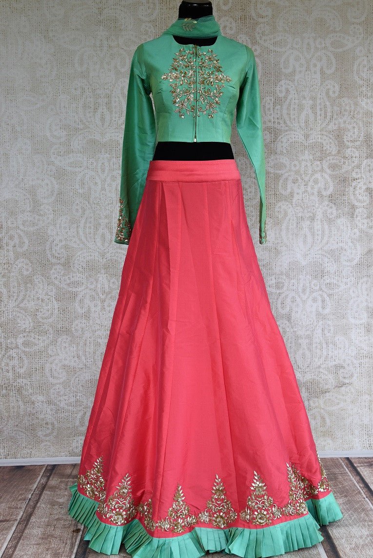 This designer blouse and lehenga skirt set is a beautiful pick for pre-wedding functions like sangeet or cocktail. The green silk blouse is perfectly ornated with zardozi embroidery and has a glamorous backless design. It comes with a pink silk lehenga skirt with zardozi buta and green frill details and a net dupatta. Buy this stylish Indowestern outfit from Pure Elegance!