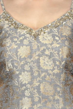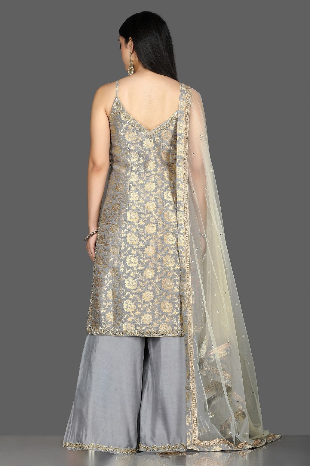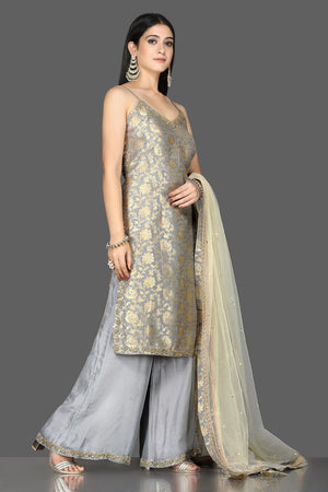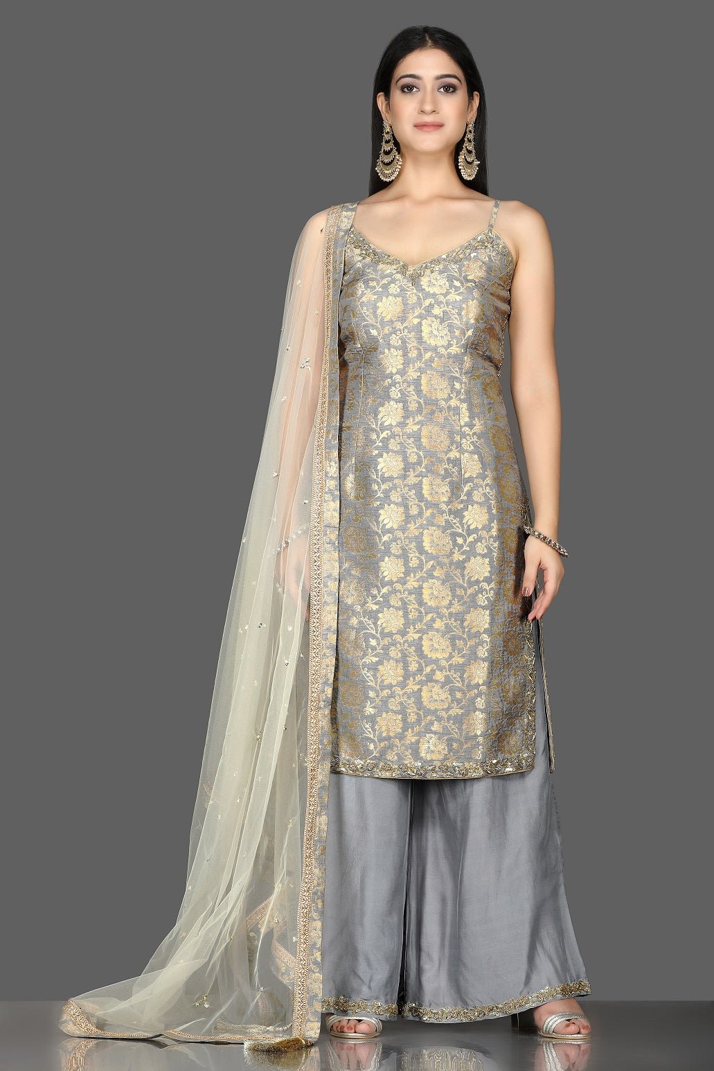 Lovely grey embroidered Banarasi kurta with crepe palazzo is a beautiful choice for festive occasions. The suit comes with a matching dupatta. Shop such designer suits online in USA from Pure Elegance.
