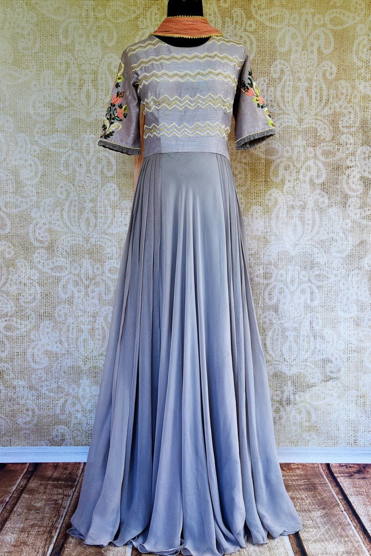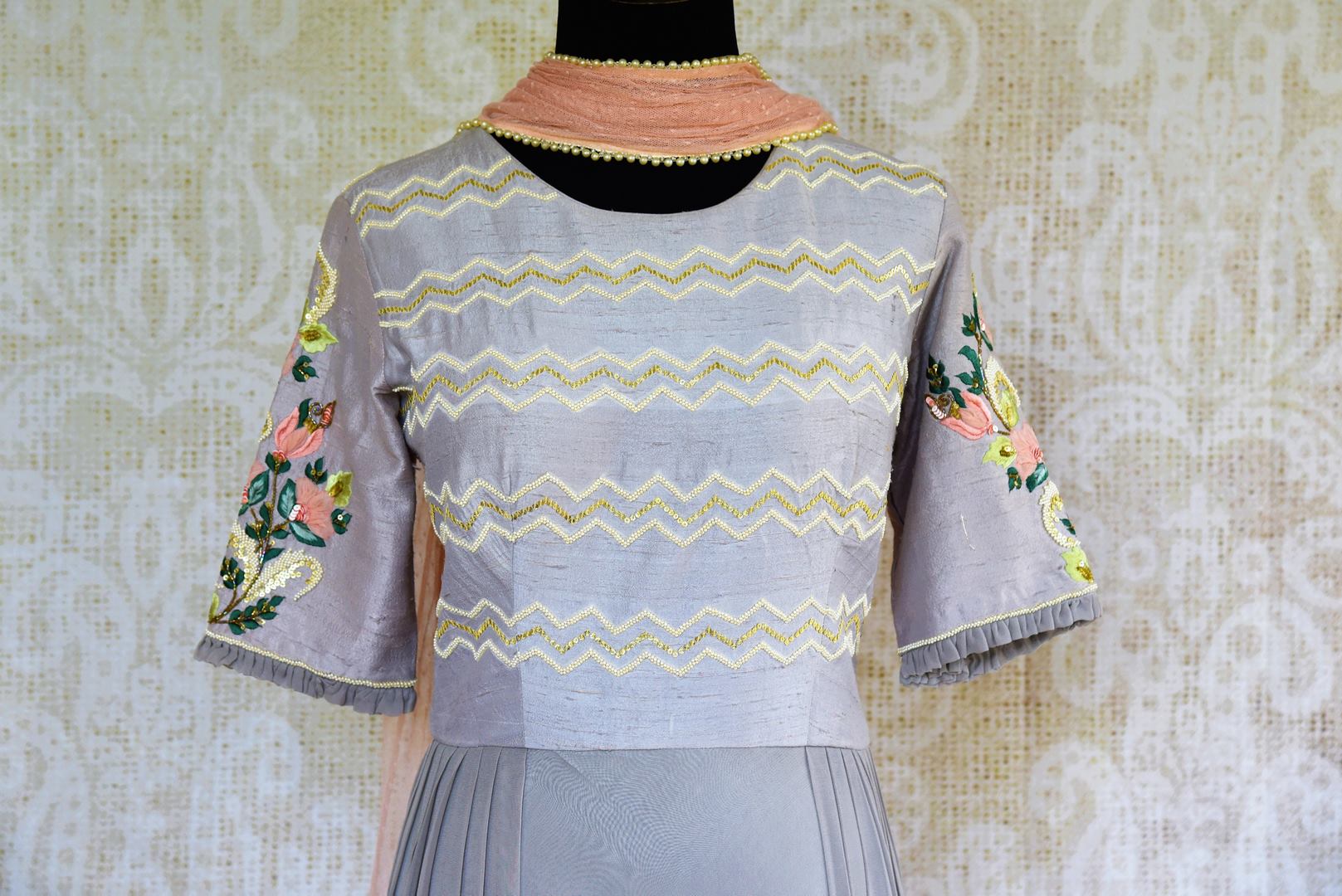 Simple yet stylish grey designer floor length Anarkali suit is a perfect choice for parties and festivals. It has a beautiful blend of fabrics with a raw silk bodice in a chevron embroidery and georgette skirt. The sleeves are highlighted with soft color embroidery. It comes with a peach dupatta. Buy online from Pure Elegance or visit our store in USA!