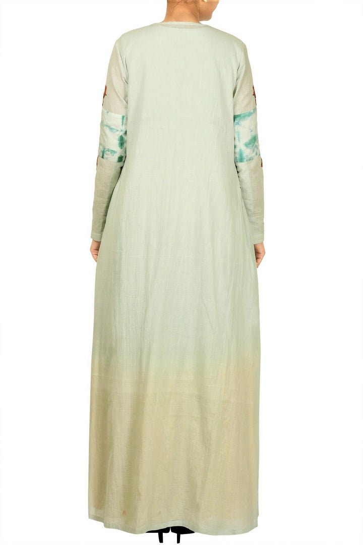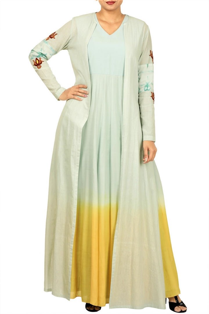 Unique style grey and yellow ombre Anarkali paired with mangalgiri jacket. The Anarkali is crafted from muslin silk and the jacket is embellished with trishul motif embroidery and samosa technique detailing. Shop online at Pure Elegance or visit our store in USA.