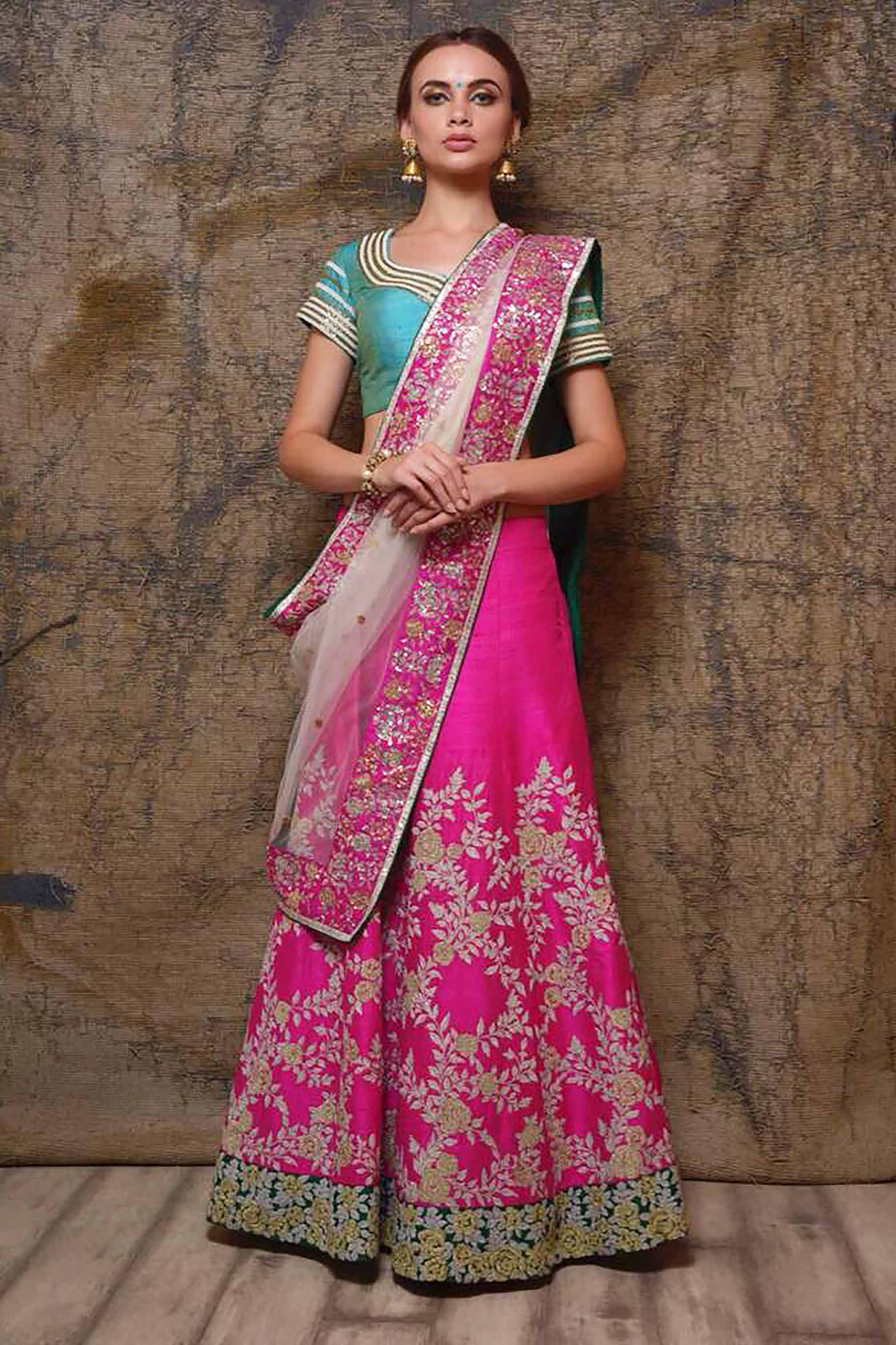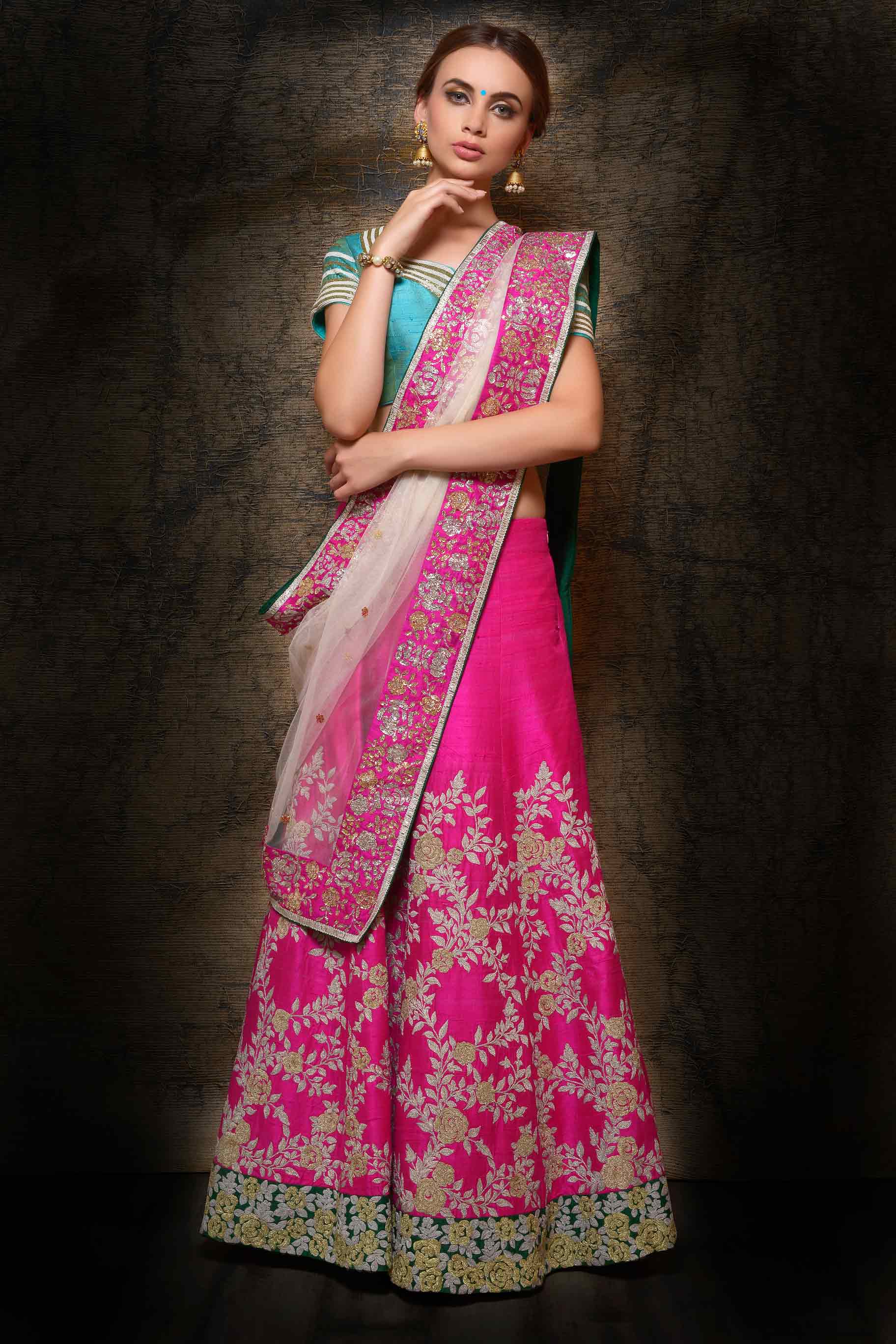 Hot pink raw silk embroidered lehenga for weddings, parties and special occasions. The lehenga is adorned with exquisite doriwork and silver and golden zari and has an emerald green border with pitta work. It comes with a striking blue color choli with pearl and cutdana work. The offwhite dupatta with scattered buta is further enhancing the beauty of this attire Shop online at Pure Elegance or visit our store in USA!