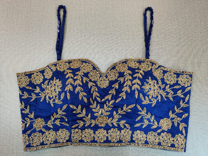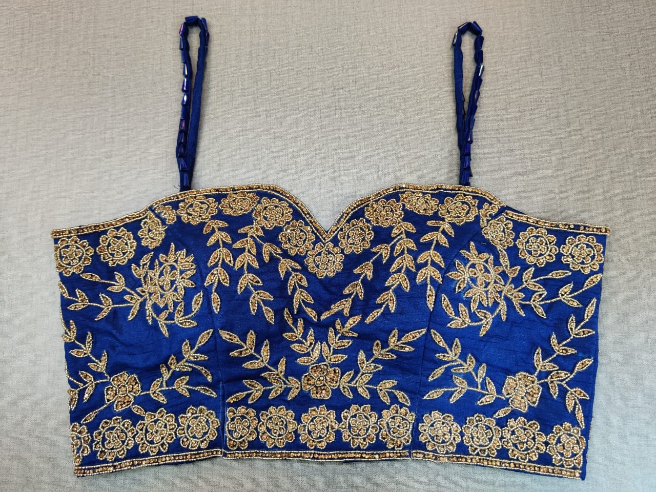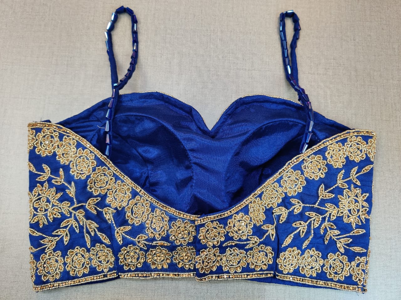 Beautiful indigo blue embroidered strappy saree blouse. Buy designer blouse in USA from Pure Elegance.