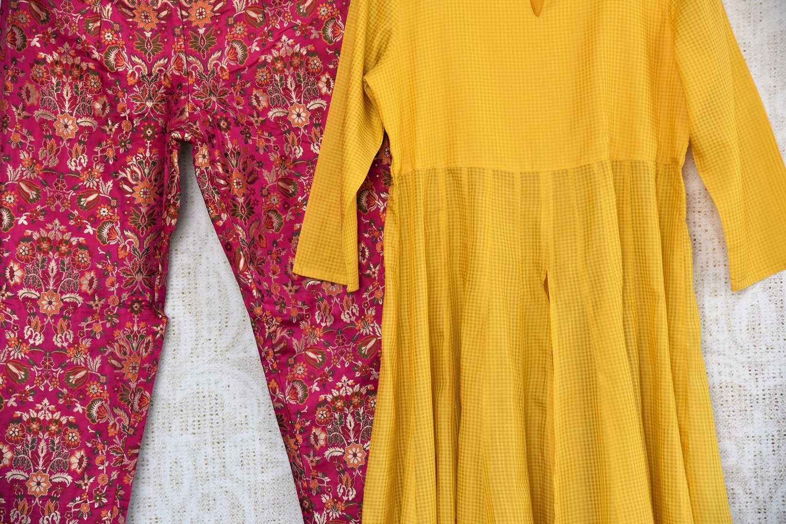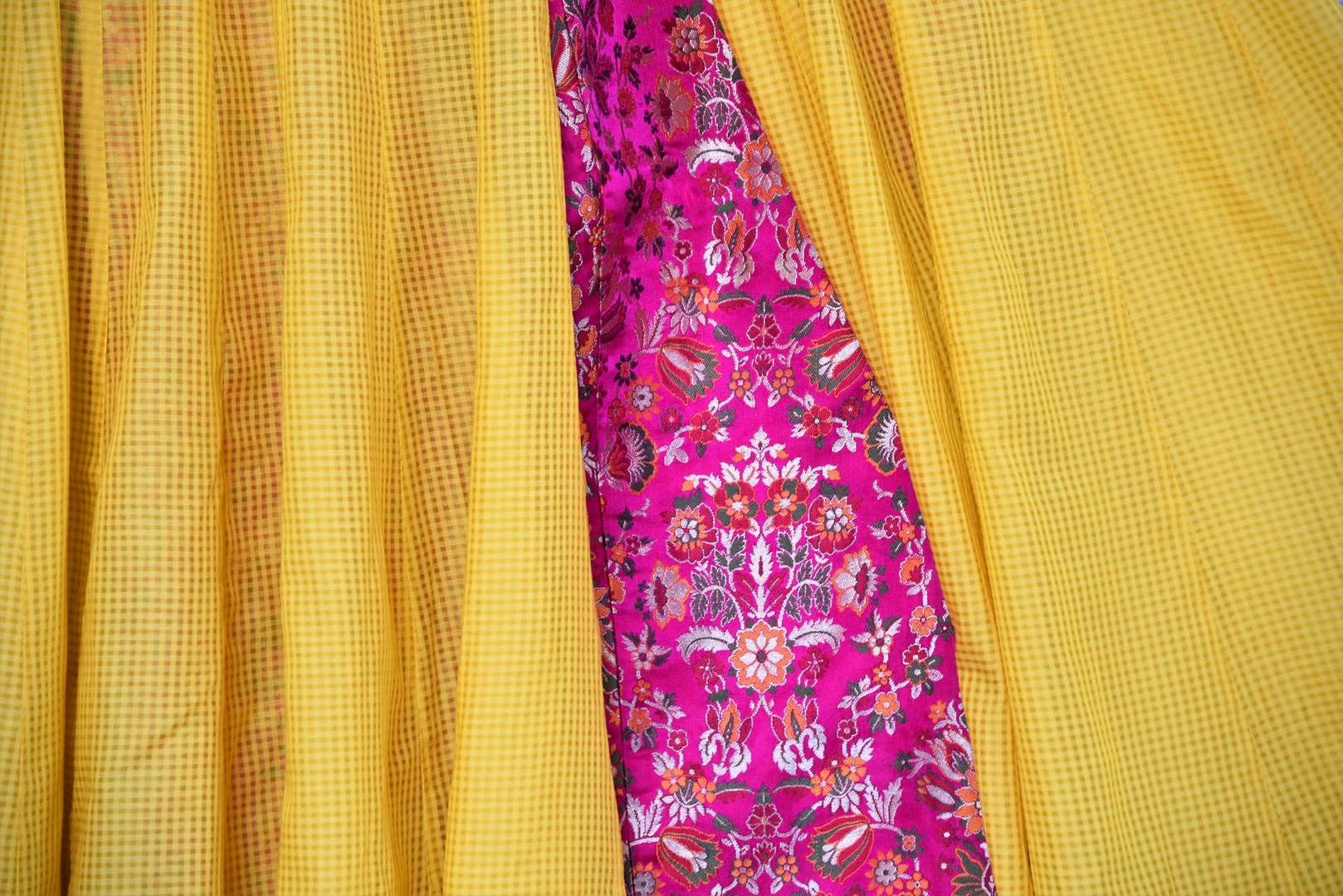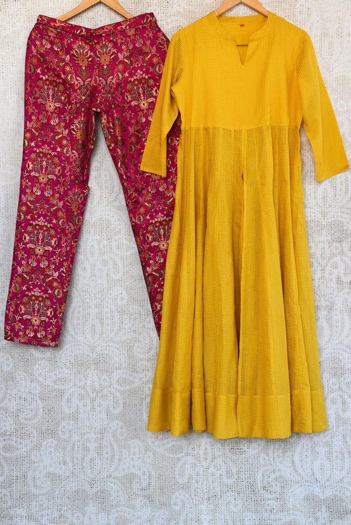 Stylish Indowestern yellow silk kurta with Banarasi pants are perfect for a unique style! The contrasting pink Banarasi pants add perfect festive touch to the attire. Buy online at Pure Elegance or visit our store in USA!