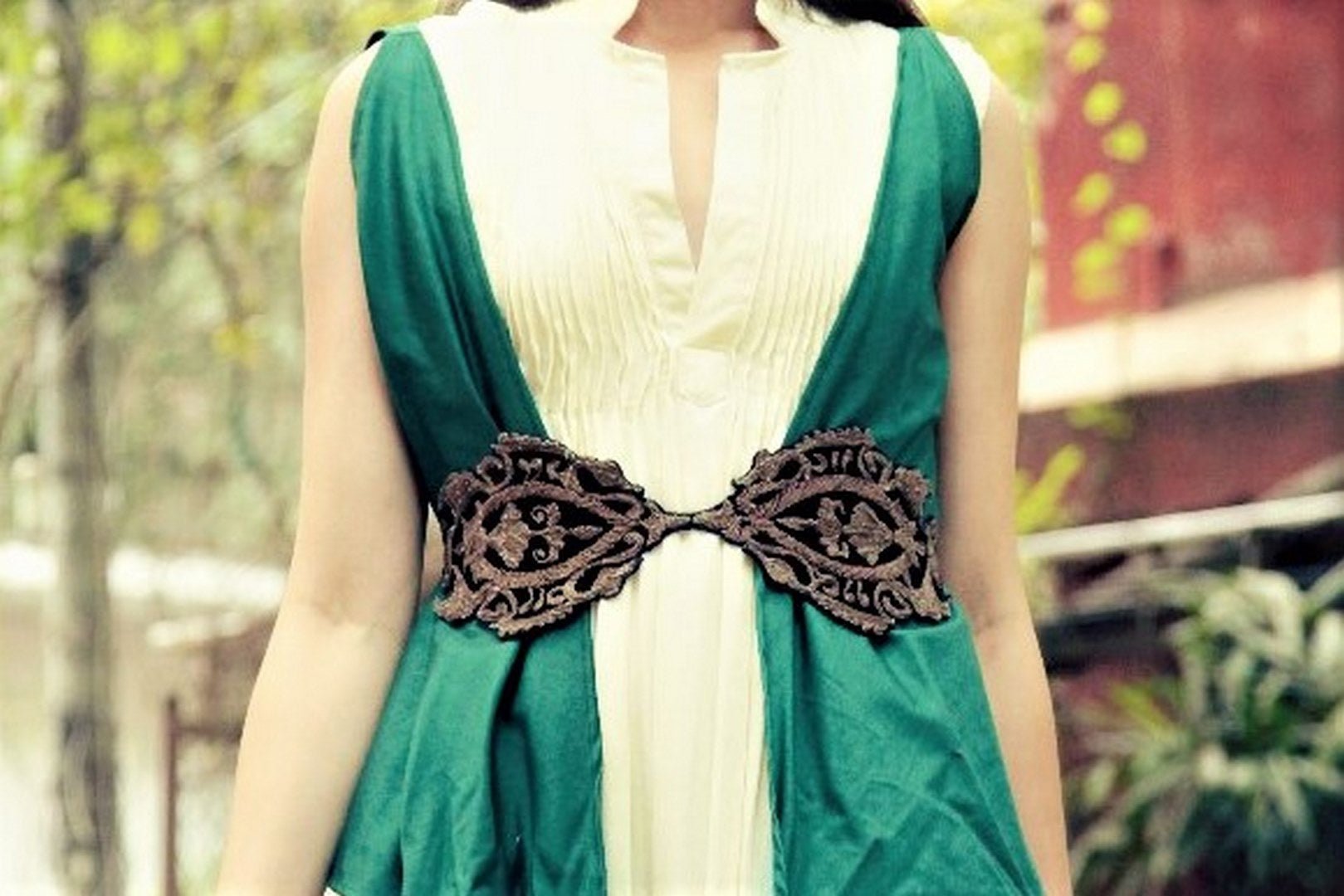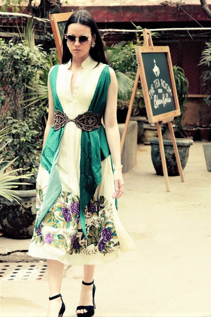 Make a stylish statement with ivory long tunic kurta piece with embroidered roses! The tunic comes with a green asymmetric jacket with an embroidered belt. Shop online at Pure Elegance or visit our store in USA!