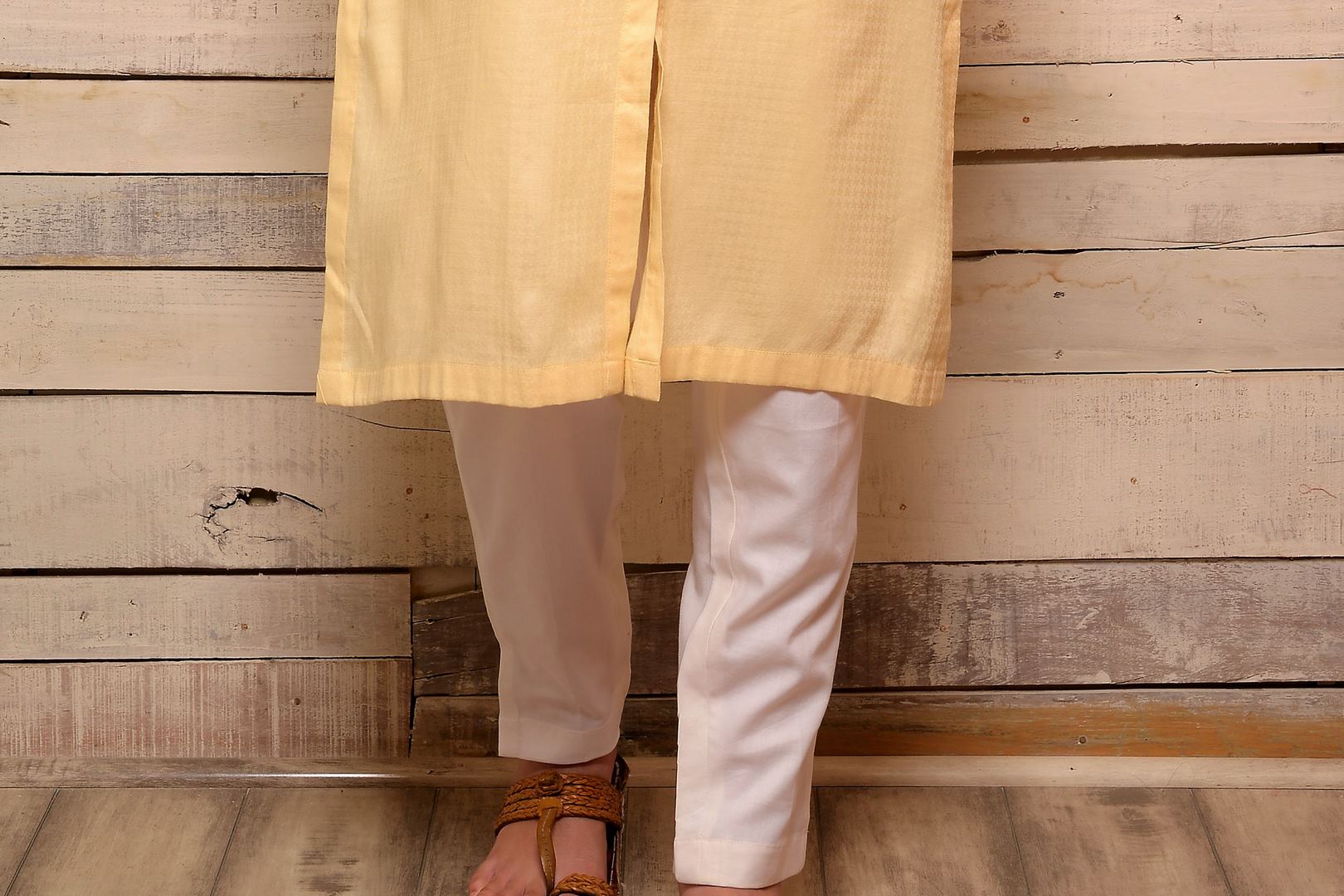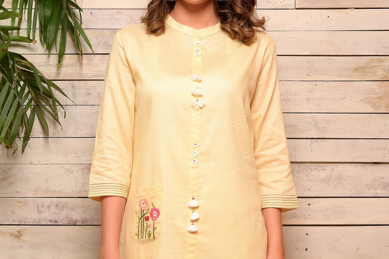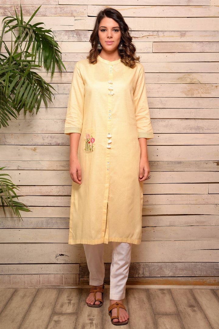 Look as fresh as a spring flower in this lemon yellow cotton embroidered kurta with white pants from AAS by Aarti Gupta. The self-weave kurta is adorned with embroidery on the pocket and back yoke. It is embellished with seashells buttons and tassels. Shop online at Pure Elegance or visit our store in USA.