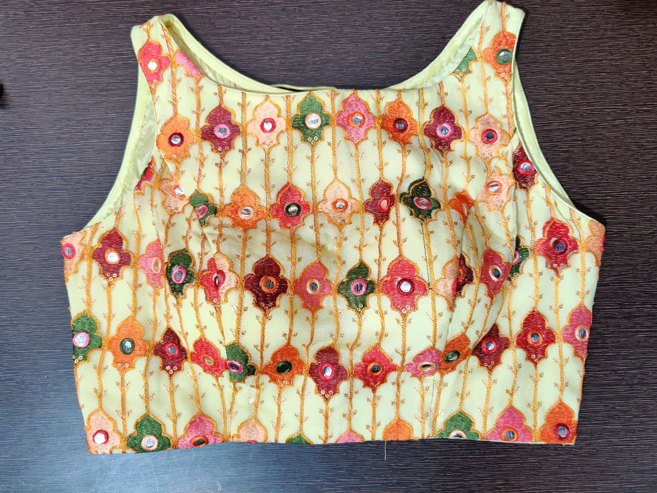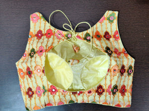 Stunning lemon yellow mirror work sleeveless saree blouse. Shop designer saree blouse online in USA from Pure Elegance.