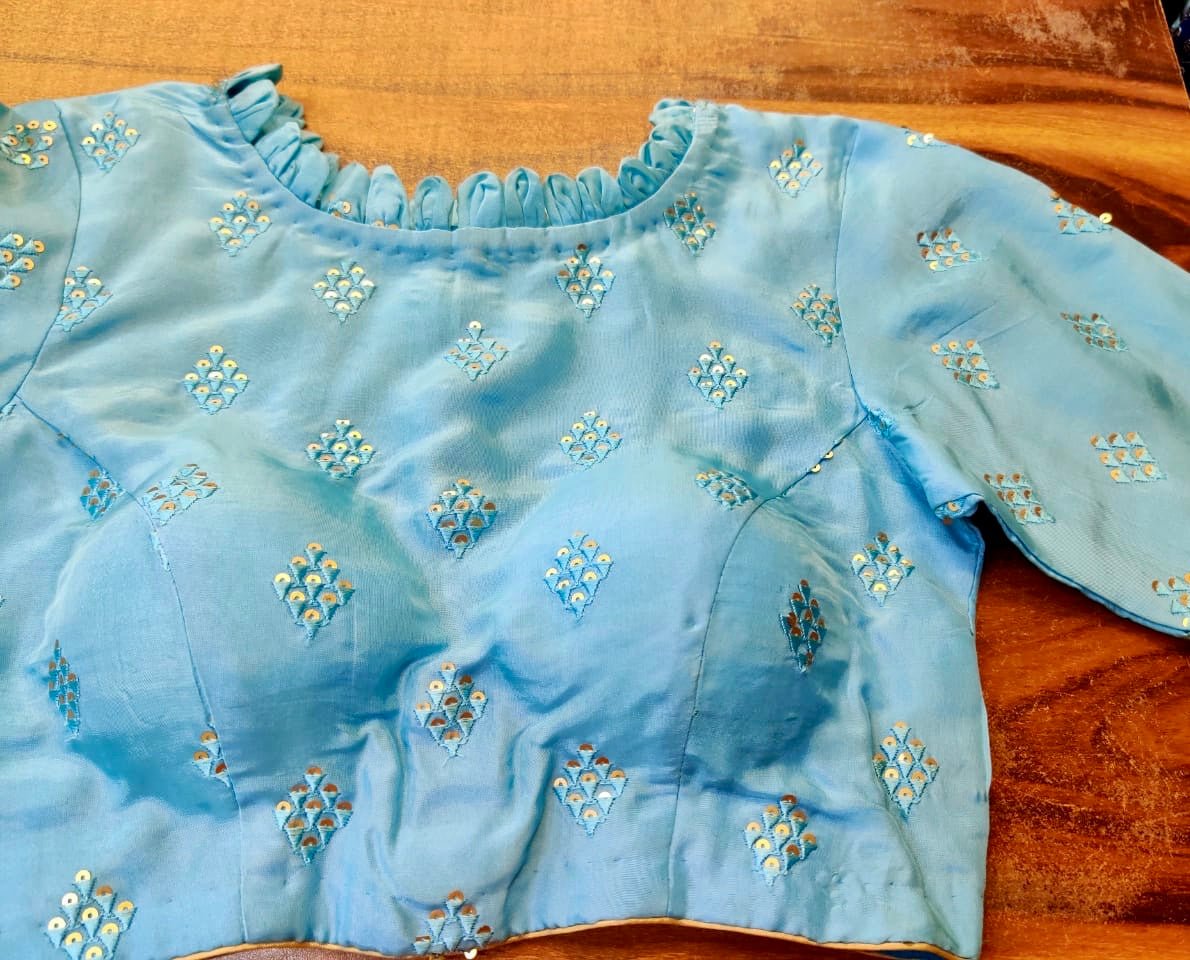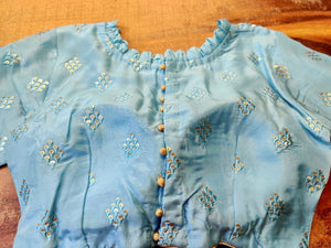 Stunning light blue embroidered designer saree blouse. Buy online from Pure Elegance