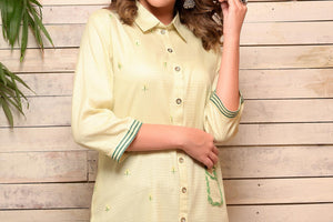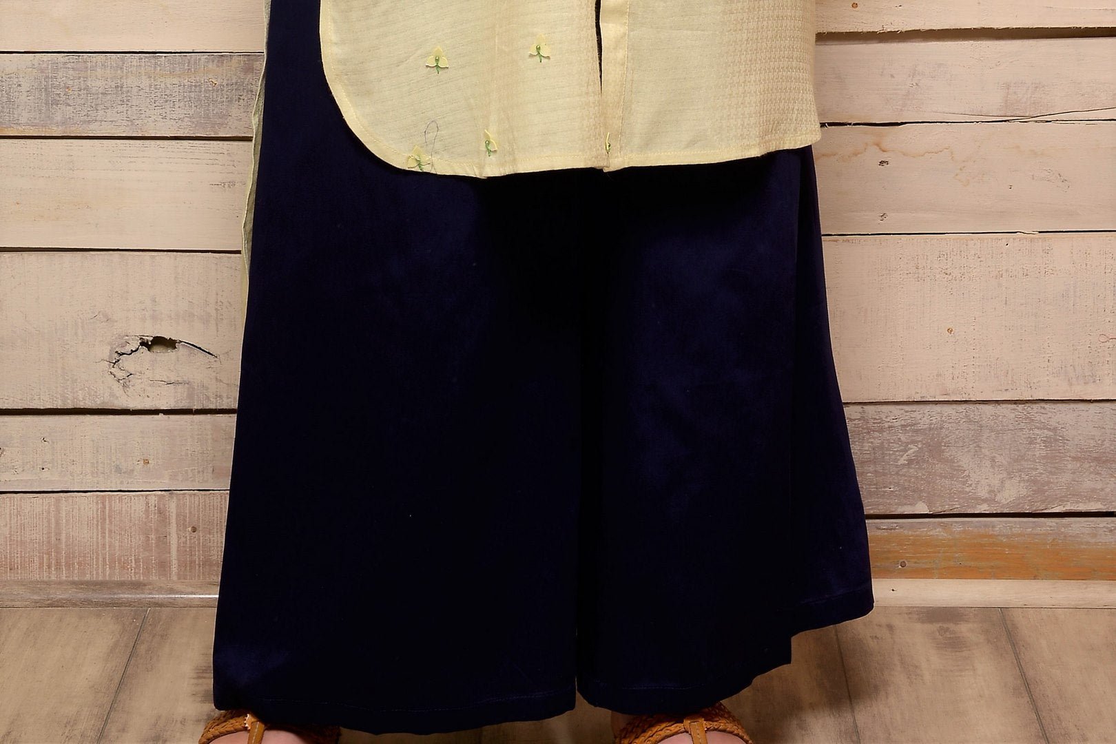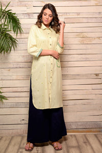 Go for an effortless ethnic style with this light green embroidered cotton collared kurta with contrasting palazzo from AAS by Aarti Gupta. The kurta is crafted with leaf shape embroidered motifs along with embroidered pocket. Shop online at Pure Elegance or visit our store in USA.
