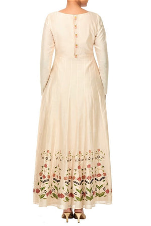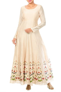 Radiate elegance at a daytime party with this light peach chanderi floor length Anarkali dress with block print. It is paired with pink dupatta. Shop online at Pure Elegance or visit our store in USA.
