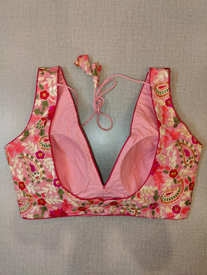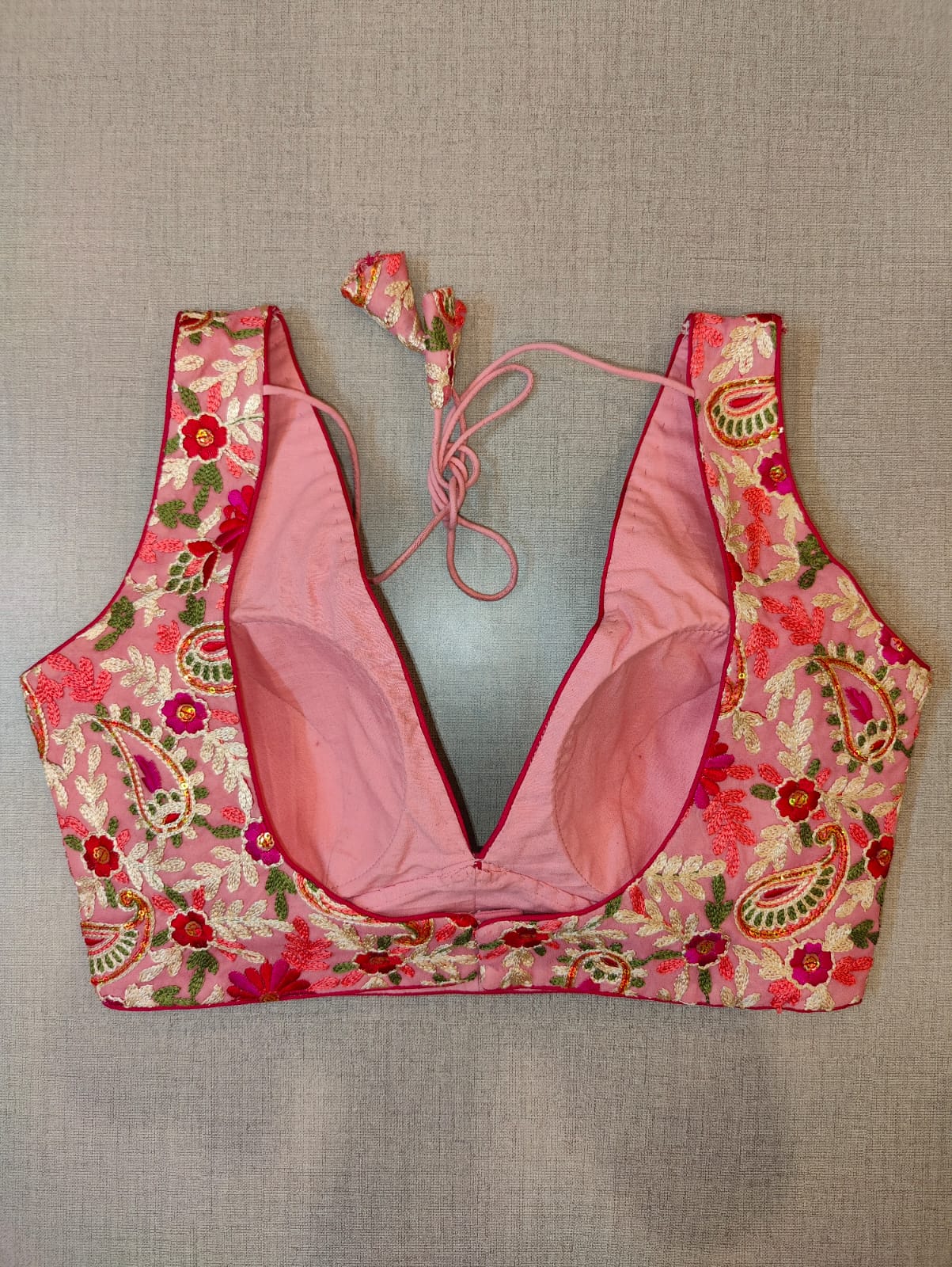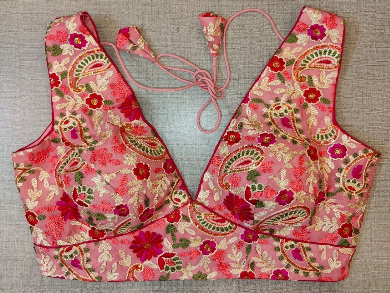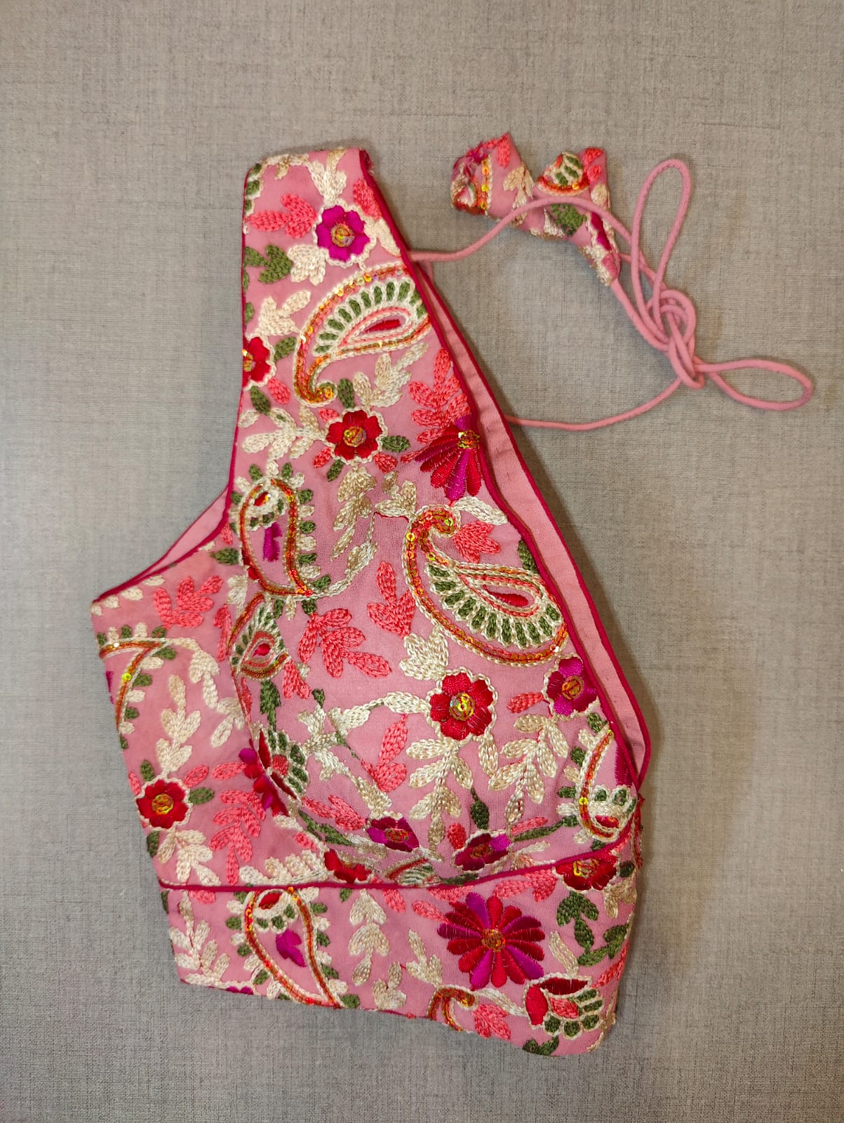 Stunning light pink aari embroidery sleeveless saree blouse. Buy designer blouse in USA from Pure Elegance.