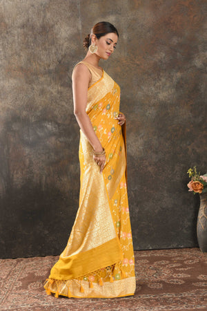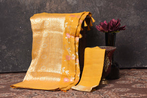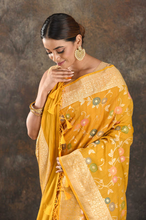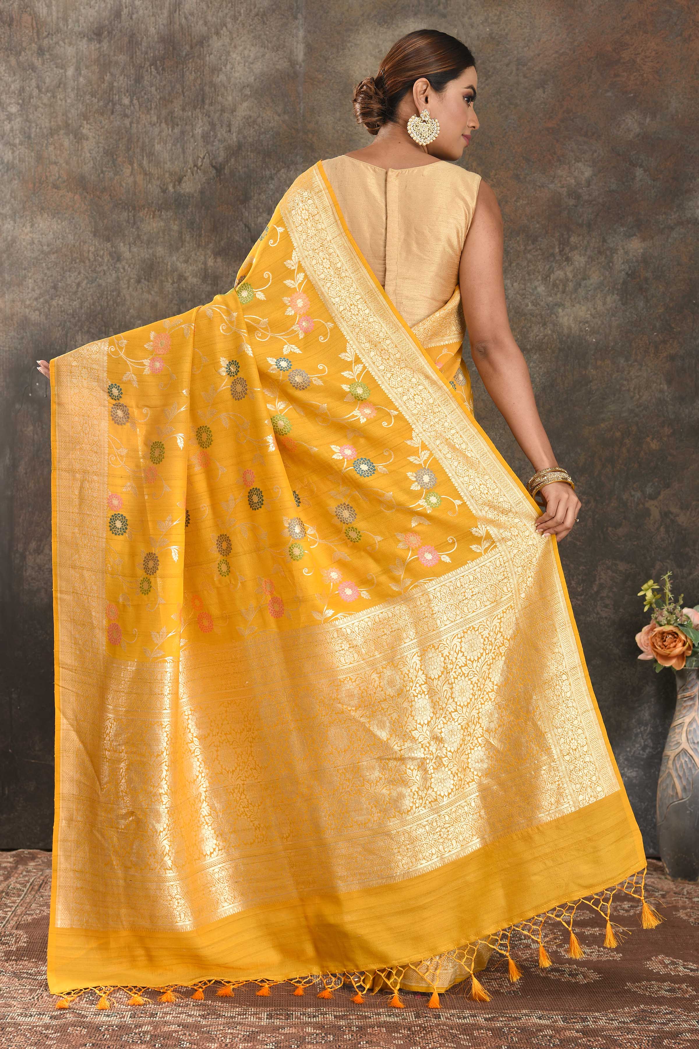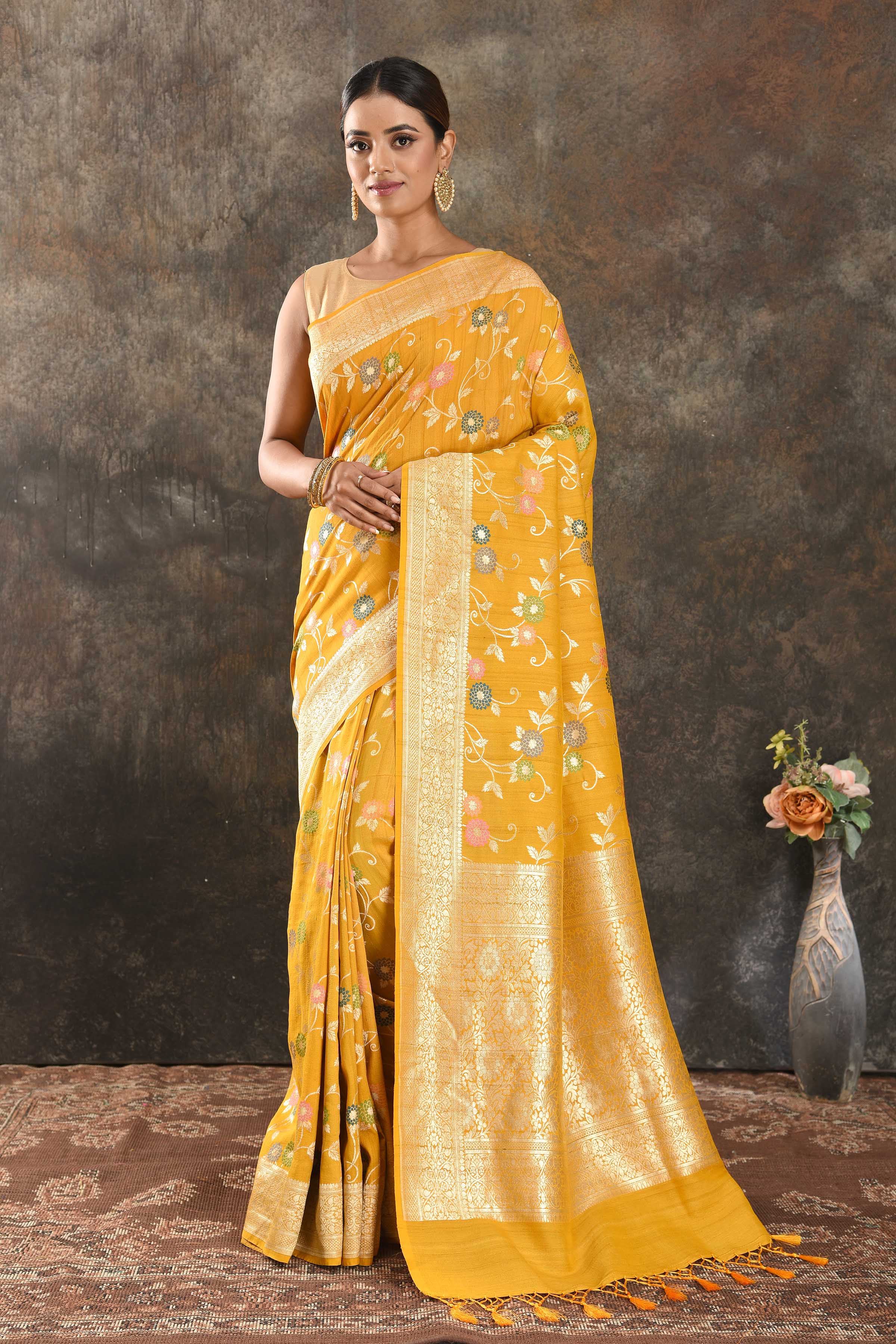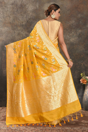 Be vision of elegance on special occasions in this stunning mango yellow tussar Banarasi saree. It enhanced with floral golden zari minakari jaal and pallu. It comes with a matching blouse piece.