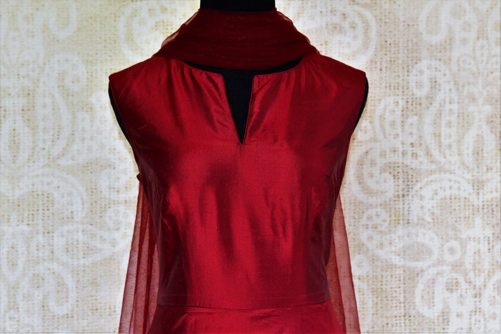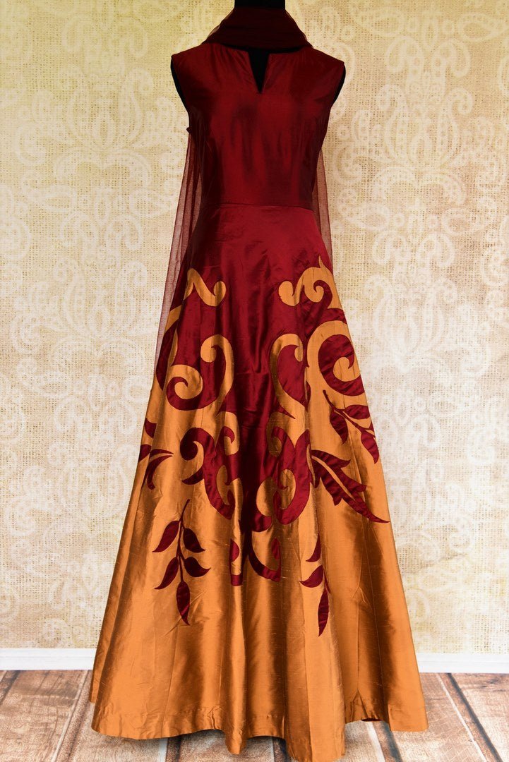 This stylish maroon and brown Anarkali Suit is a classy choice for a cocktail party. It is understated and minimal which makes it sophisticated. The applique work on the suit creates an interesting effect. It comes with a maroon dupatta. If you are looking for an Indo-western outfit this is the right pick for you! Buy online from Pure Elegance or visit our store in USA!