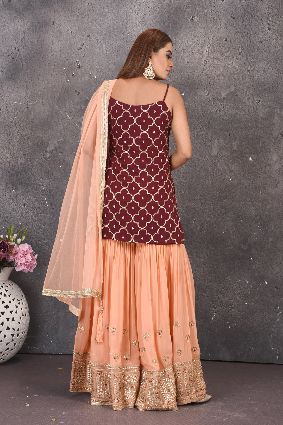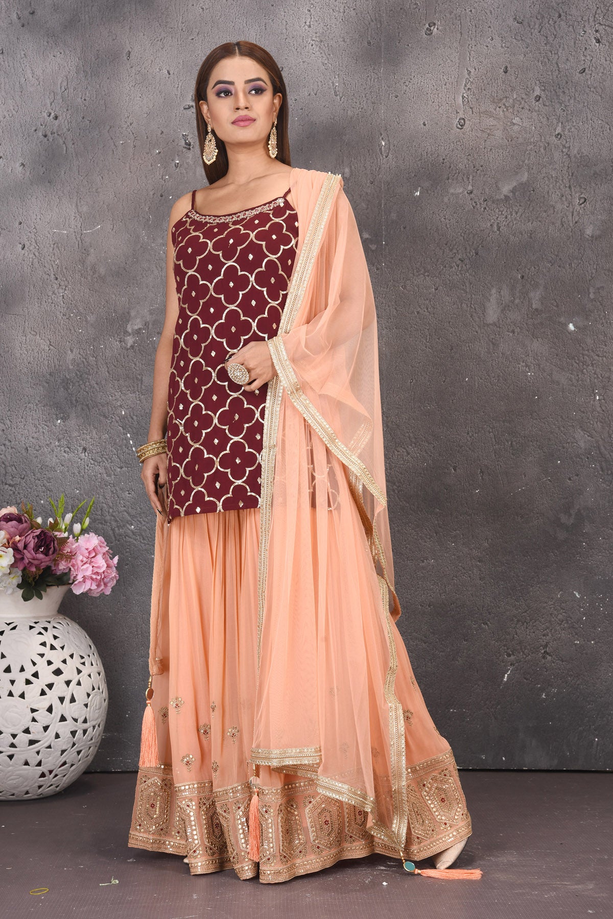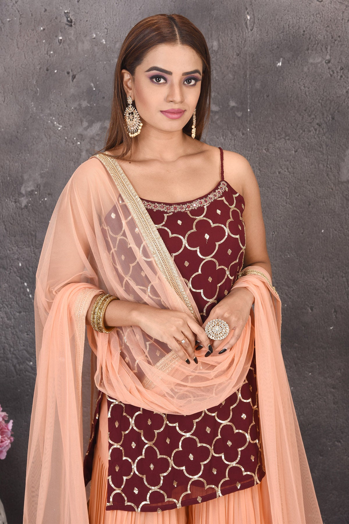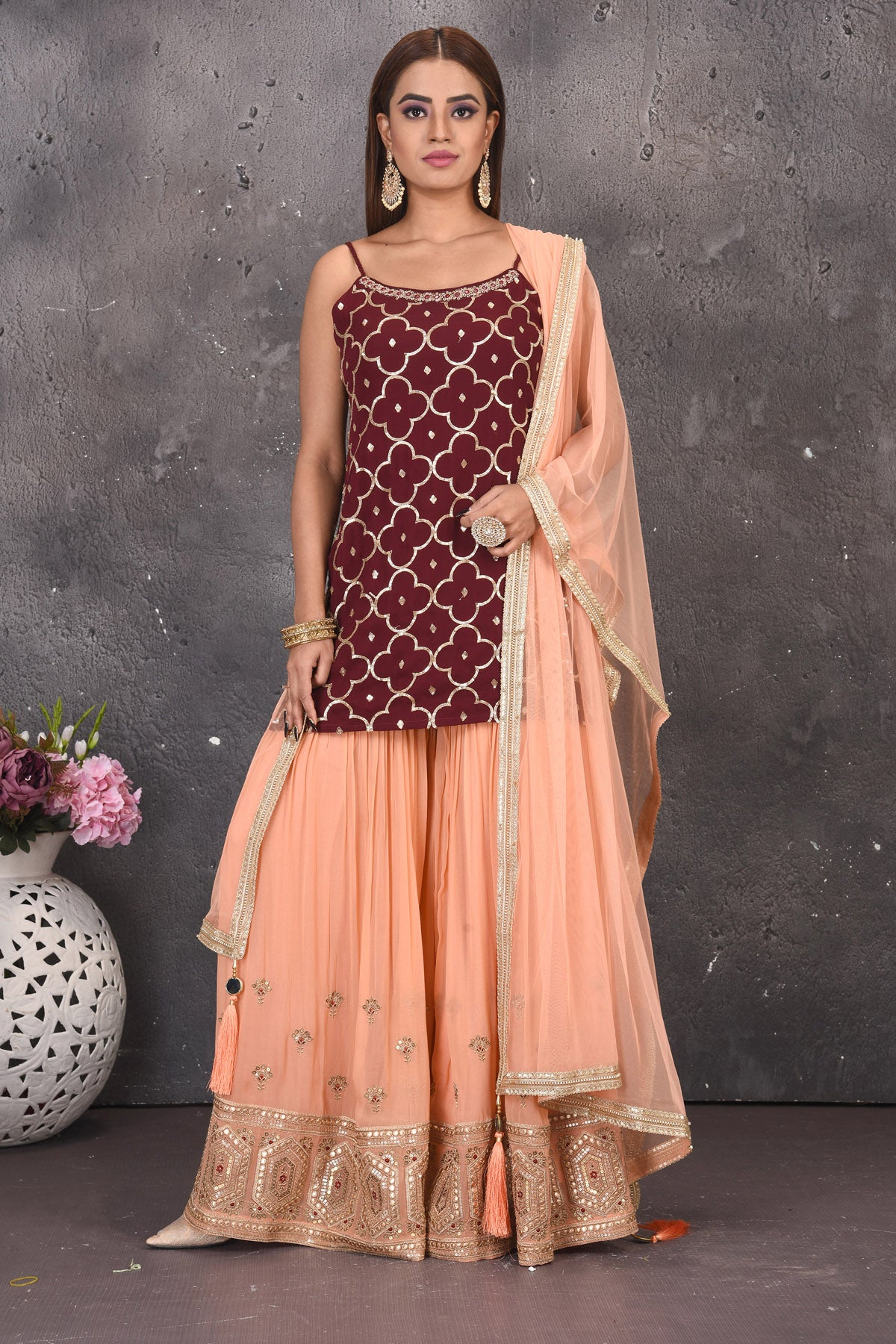 Rock ethnic style at festive occasions in this beautiful maroon and peach designer embroidered sharara suit with dupatta. Shop designer dresses in USA from Pure Elegance.