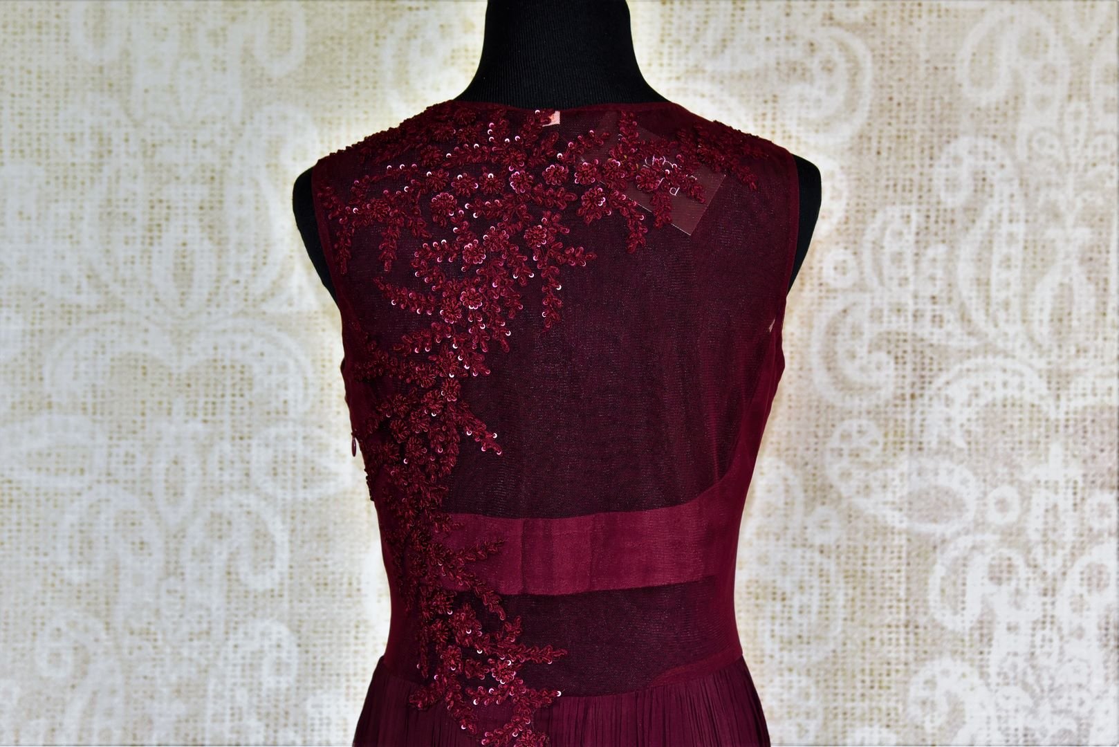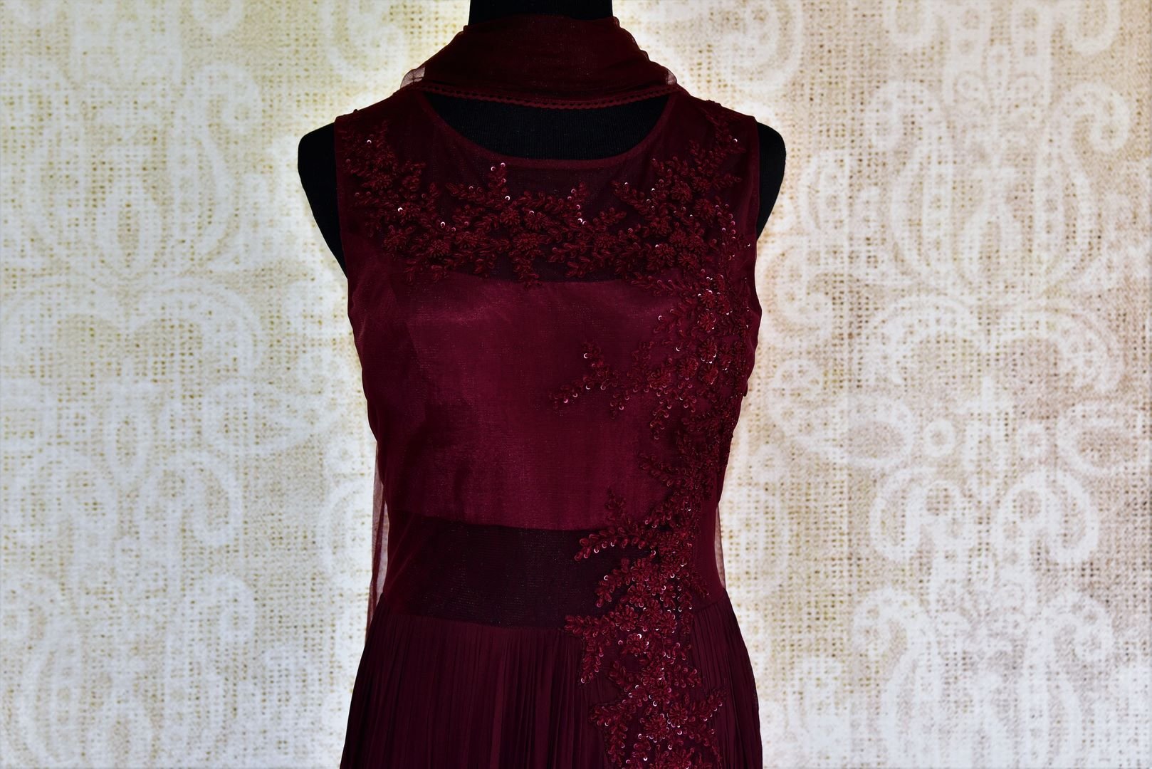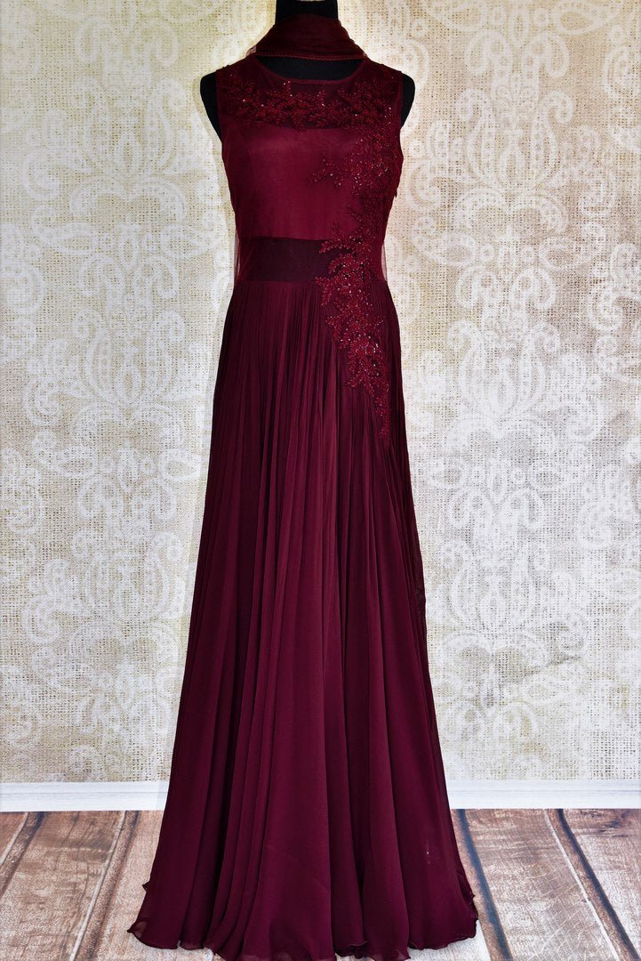 Stylish and elegant maroon georgette designer embroidered dress with dupatta is a head-turning choice for parties. The rich color of the gown is enough to do the talking and the delicate sequin embroidery on sheer net overlay decorates it perfectly. Buy online from Pure Elegance or visit our store in USA!