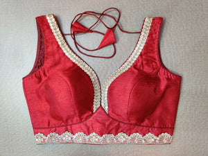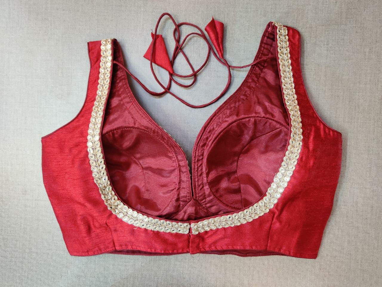 Beautiful maroon sleeveless sari blouse with silver embroidery lace. Buy designer blouse in USA from Pure Elegance.