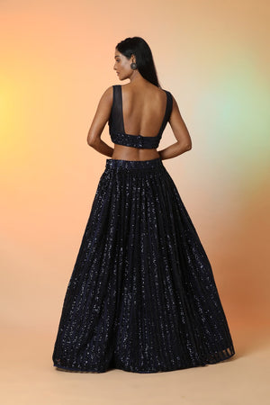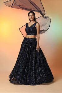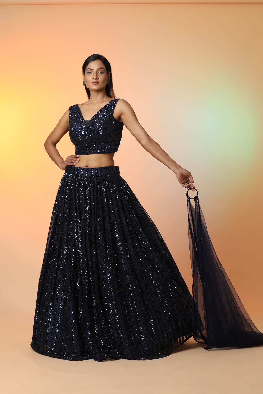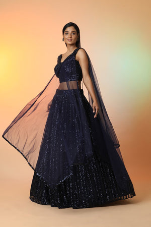 Radiate glamor at weddings and special occasions in this beautiful midnight blue embellished designer lehenga. It comes with a matching dupatta. Shop designer lehenga in USA from Pure Elegance.