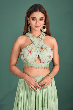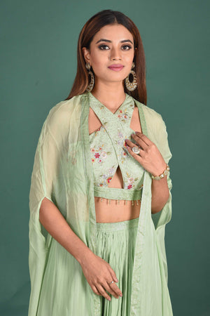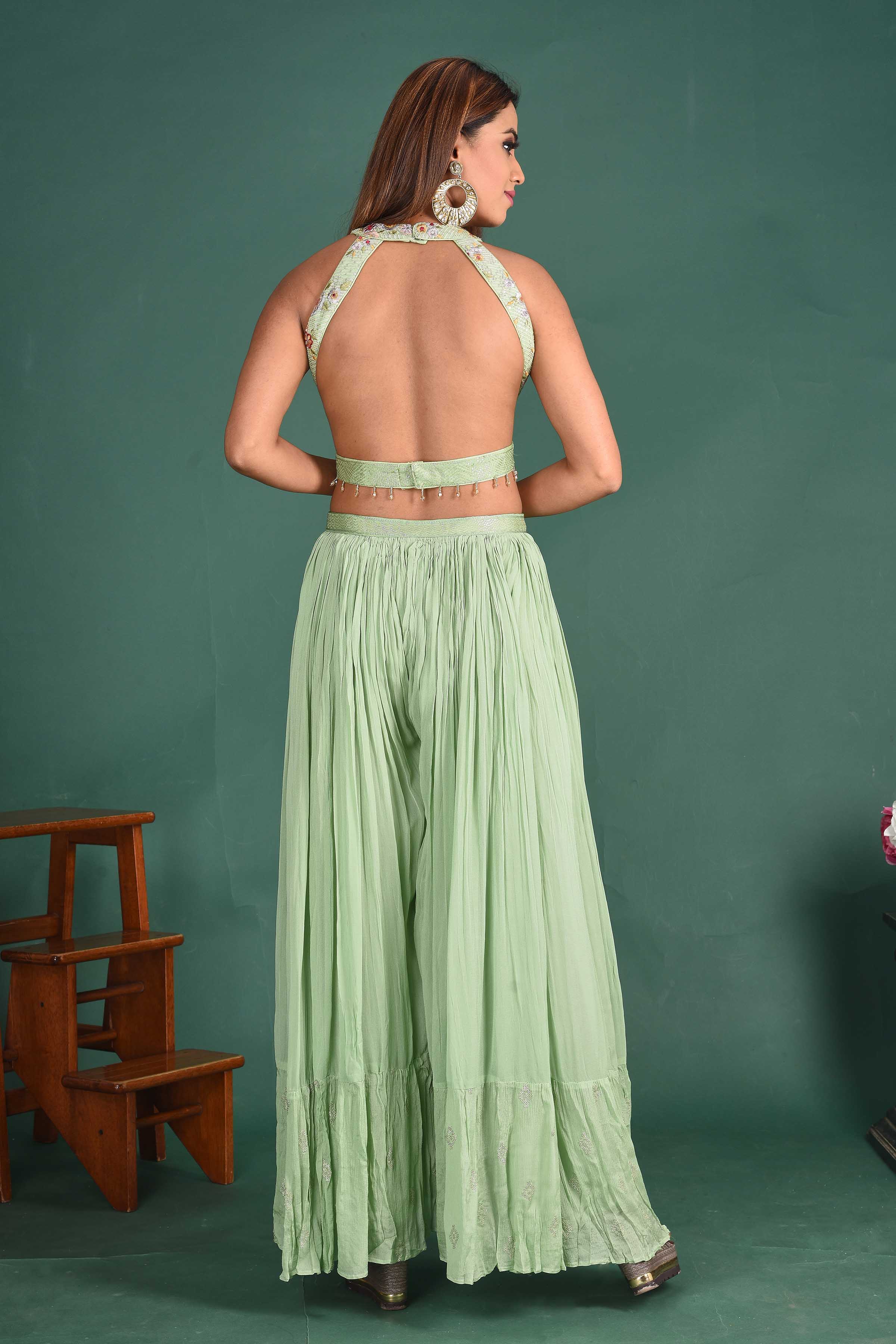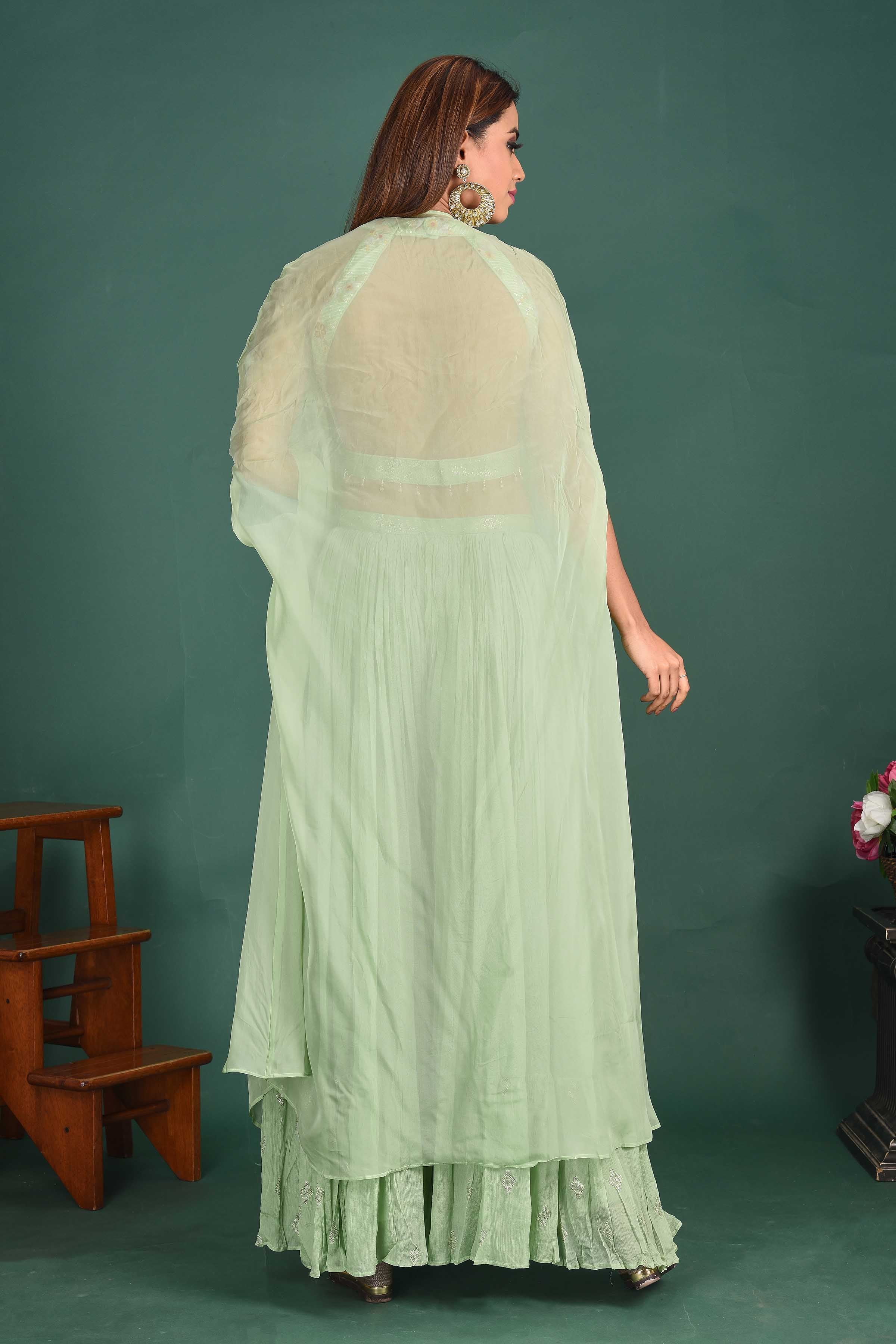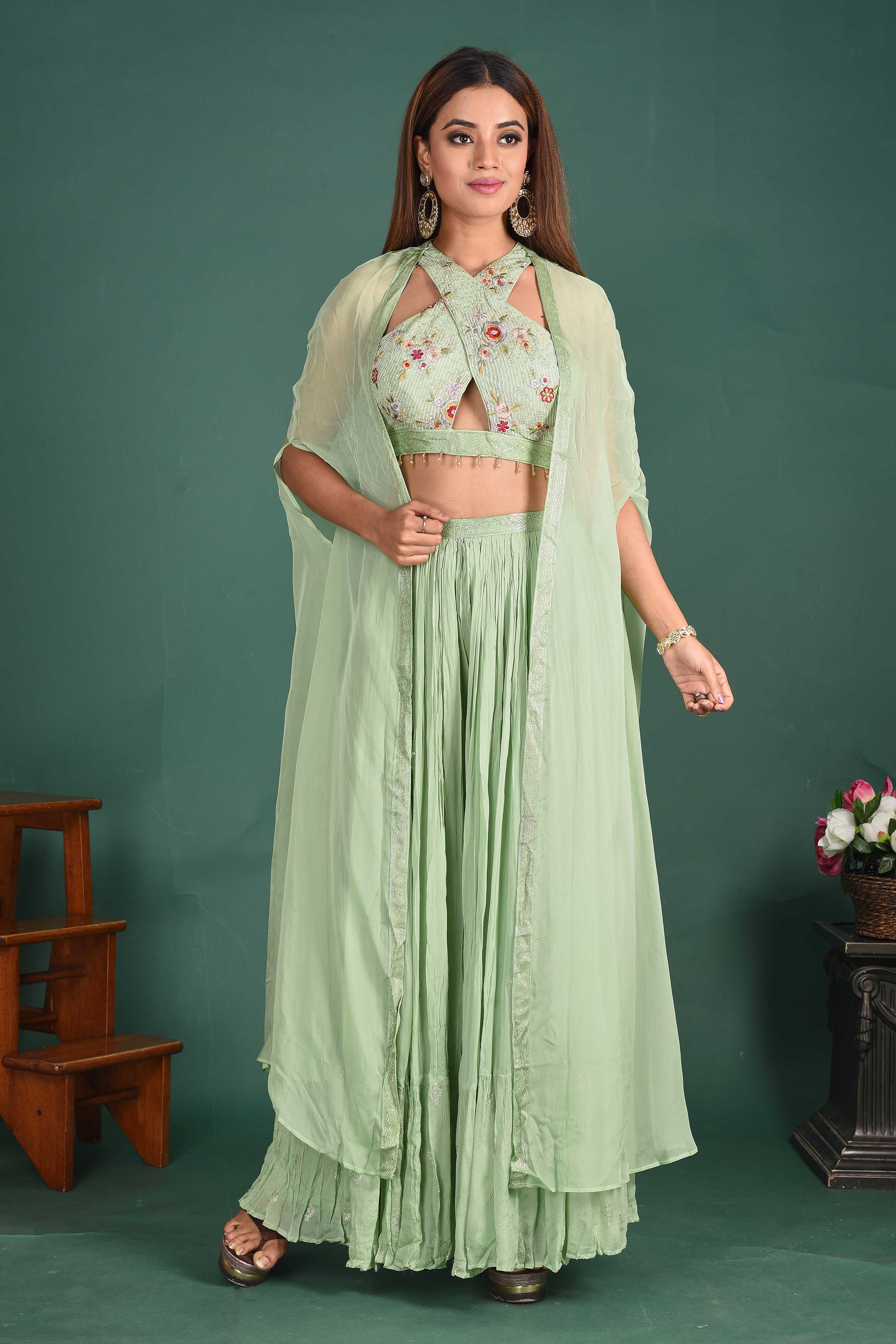 Beautiful mint green embellished crop top and palazzo and cape. It is perfect for parties and special occasions. Shop online from Pure Elegance.