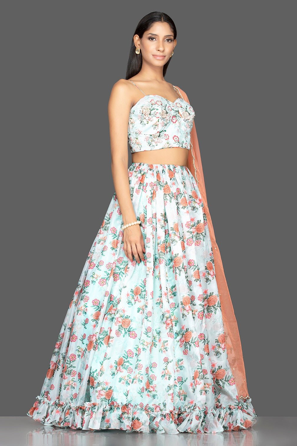 Channel your inner diva on weddings and special occasions in this captivating mint green embroidered organza floral lehenga. It comes with a peach dupatta. Buy exquisite designer Indian dresses in USA from Pure Elegance. Ready Blouse Size: 38" Ready Lehenga Length: 42"